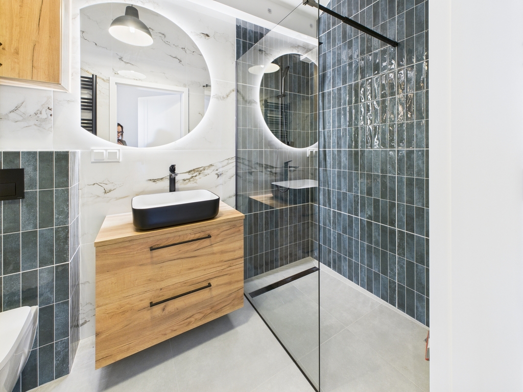 * łazienka: szkliwione, ciemne płytki, betonowa posadzka, czarna armatura, podświetlane okrągłe lustro