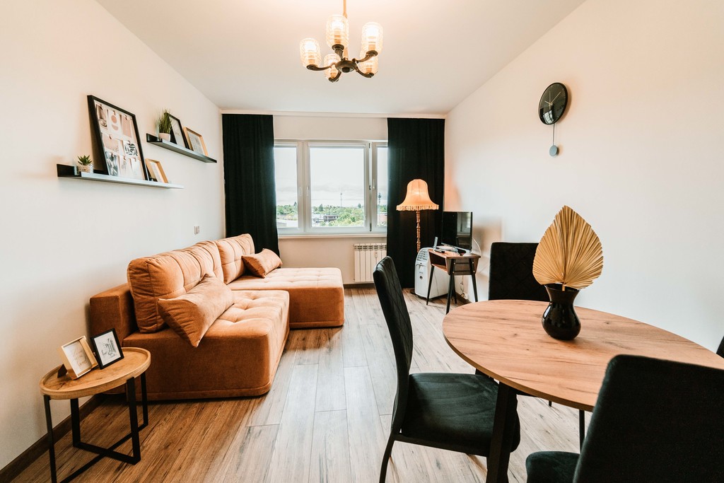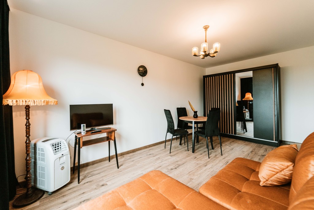 - salon⁠ przestronny wystylizowany z kilkoma zachowanymi historycznymi dodatkami z poprzedniej epoki - 18,5 m2,