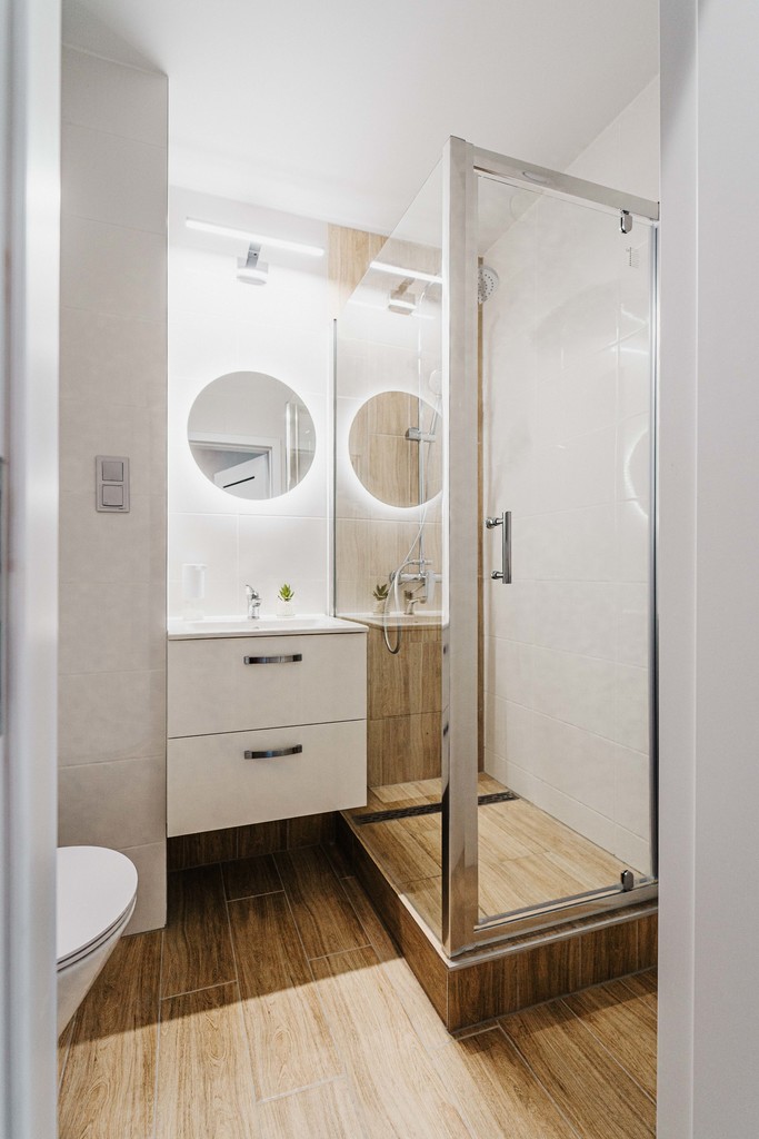 - ⁠łazienka z nową zabudową prysznica, toaletą, podświetlanym lustrem - 3 m2.