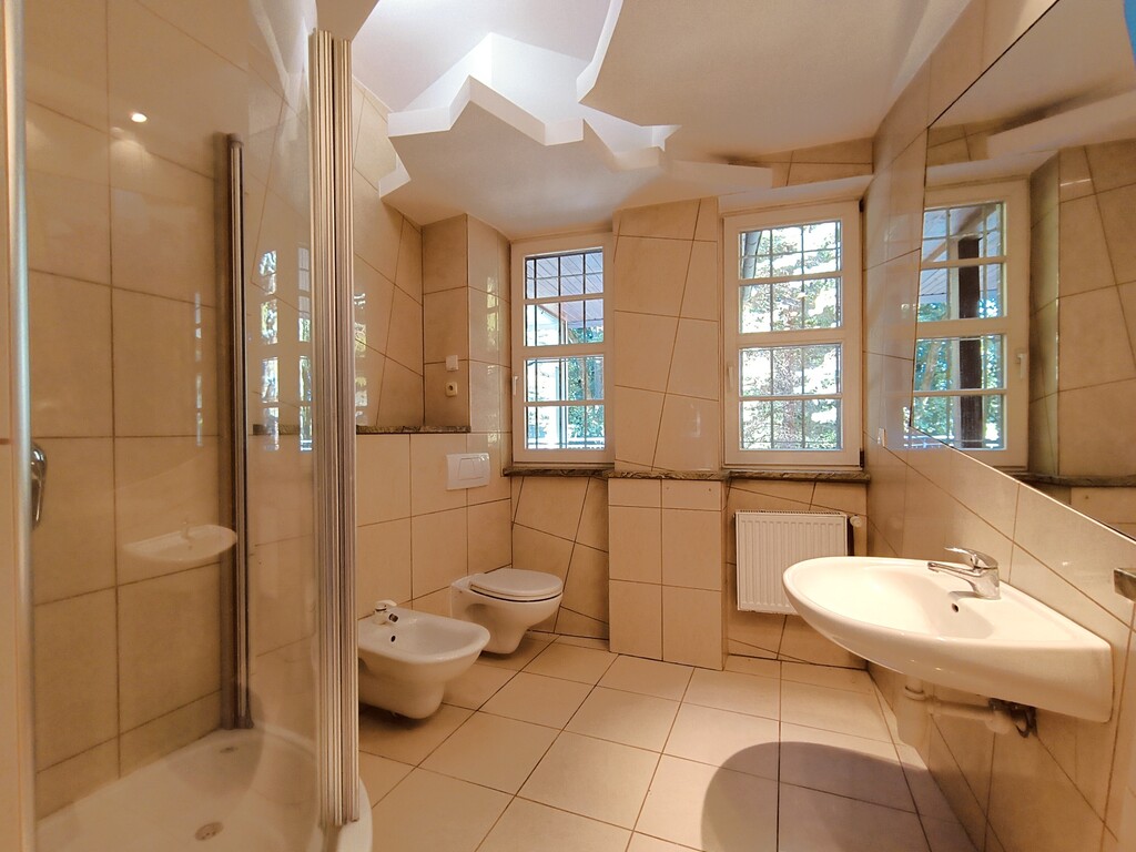 - dużej łazienki z kabiną prysznicową, WC, bidetem i umywalką,