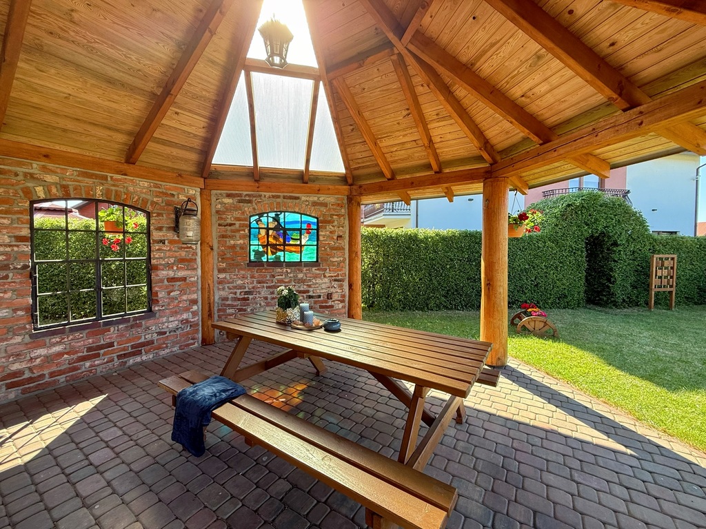Pensjonat otoczony jest dużym, zadbanym ogrodem z licznymi nasadzeniami, który zapewnia gościom miejsce do relaksu oraz odpoczynku na świeżym powietrzu. Dodatkowo, na terenie obiektu znajduje się przestronna altana, która może pomieścić około 70 osób – doskonałe miejsce do organizacji eventów, przyjęć czy spotkań integracyjnych.