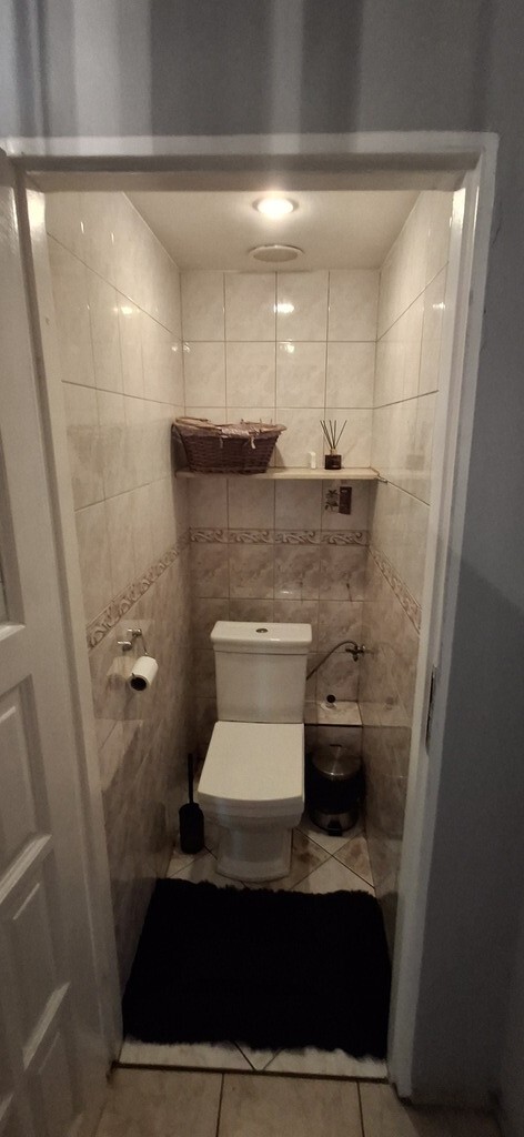 Łazienka jest po remoncie . Została w niej zainstalowana kabina i umywalka oraz piękne przesuwane drzwi. Toaleta osobno