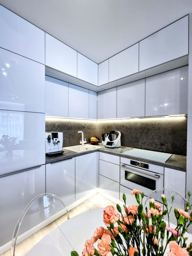 Całość wnętrza utrzymana jest w spójnej, nowoczesnej kolorystyce, w której dominują kontrastujące biel i szarości, podkreślające nowoczesny charakter mieszkania.