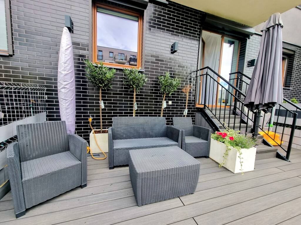 Prawdziwą perełką tej nieruchomości jest ogródek, starannie zaprojektowany i w pełni zagospodarowany – z systemem automatycznego nawadniania oraz wygodnymi meblami ogrodowymi. To miejsce, w którym można odpocząć po pracy, wypić poranną kawę lub spędzić czas w gronie najbliższych.