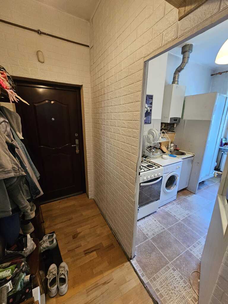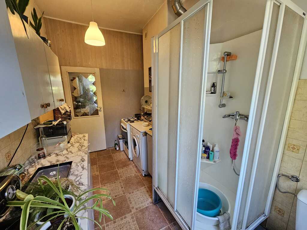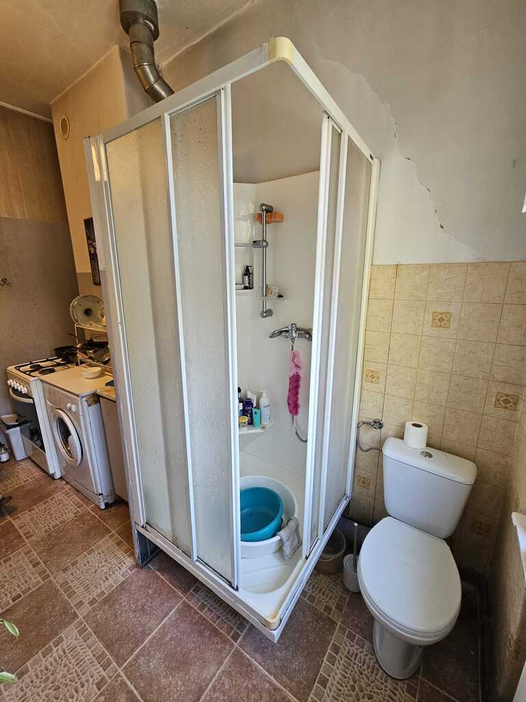 Kuchnia z oknem. Do niej wchodzimy z przedpokoju. Brak wydzielonej łazienki. W kuchni znajduje się kabina prysznicowa i wc.