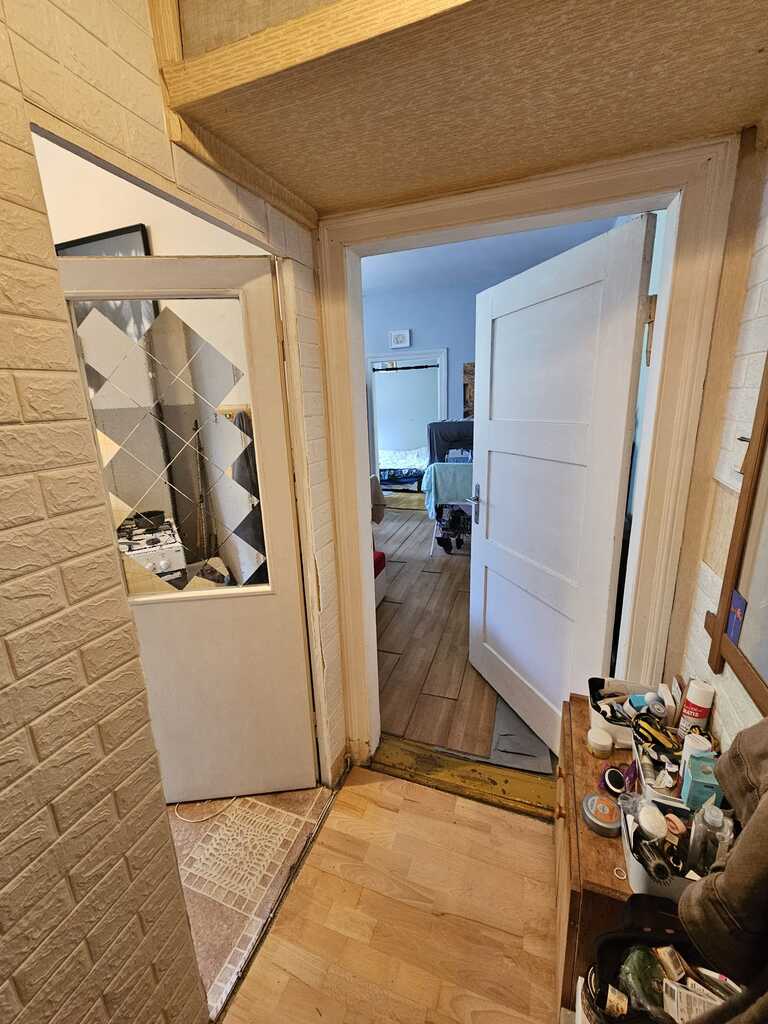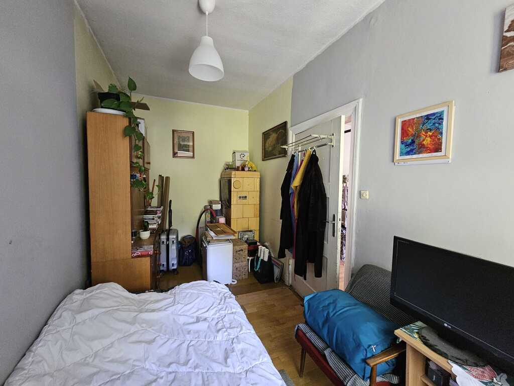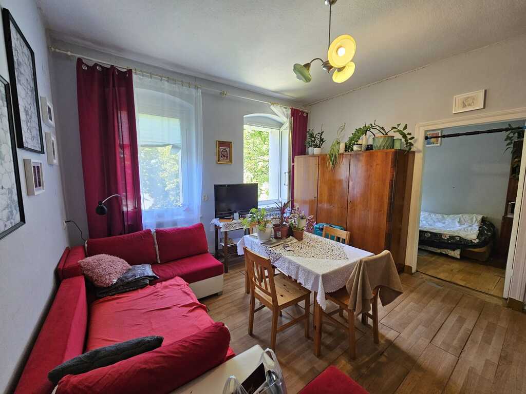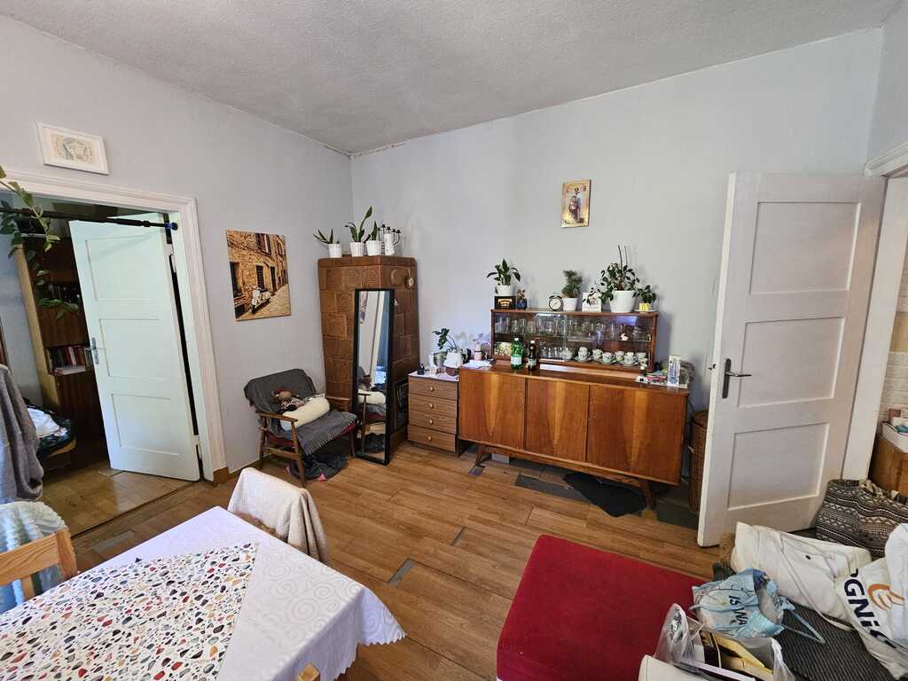 Mieszkanie w standardzie do remontu. Pokoje są przejściowe. Z większego przechodzimy do mniejszego. W obu pokojach stoją piece kaflowe.