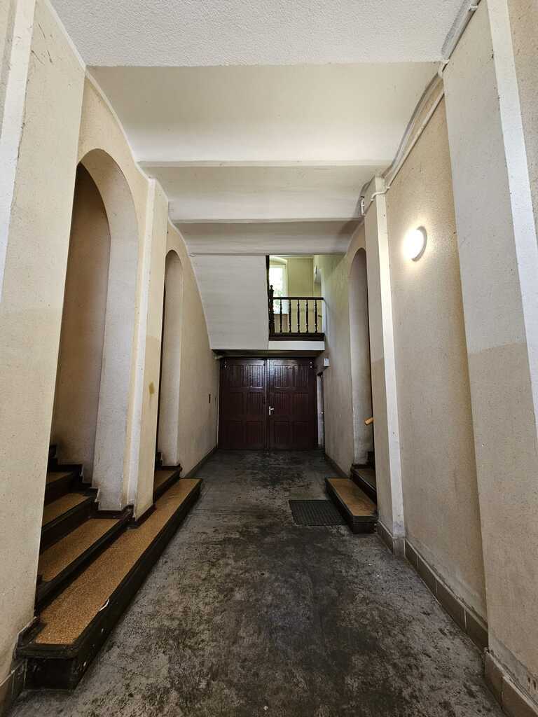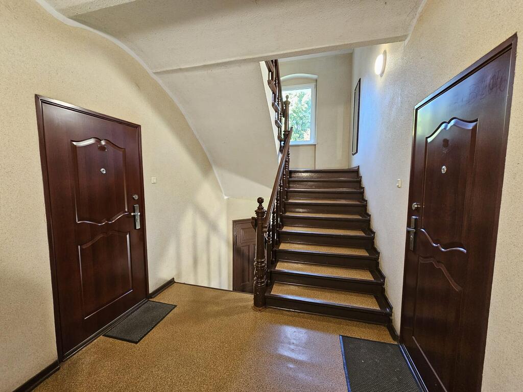 Klatka schodowa po remoncie, budynek zadbany z nową elewacją.