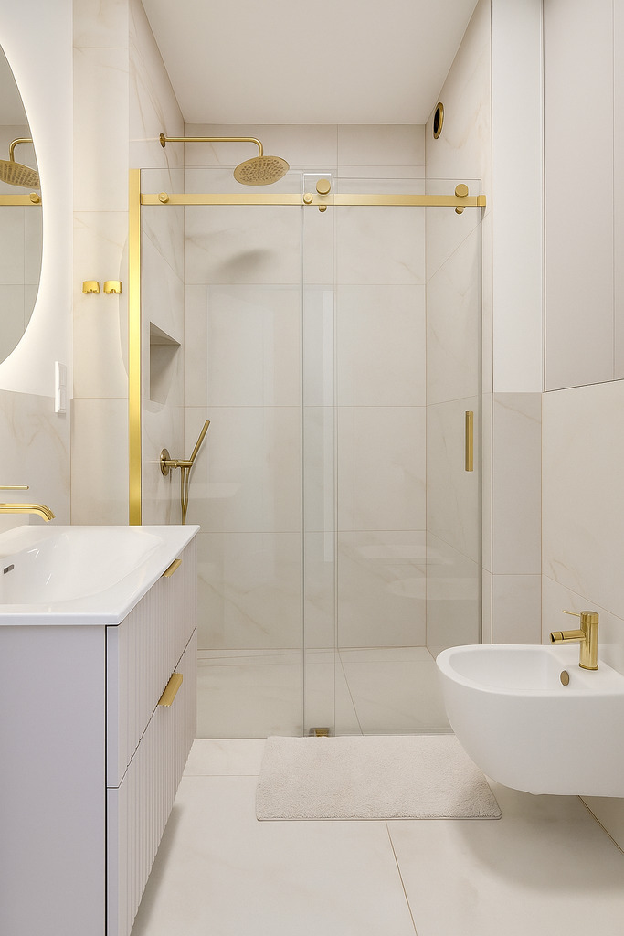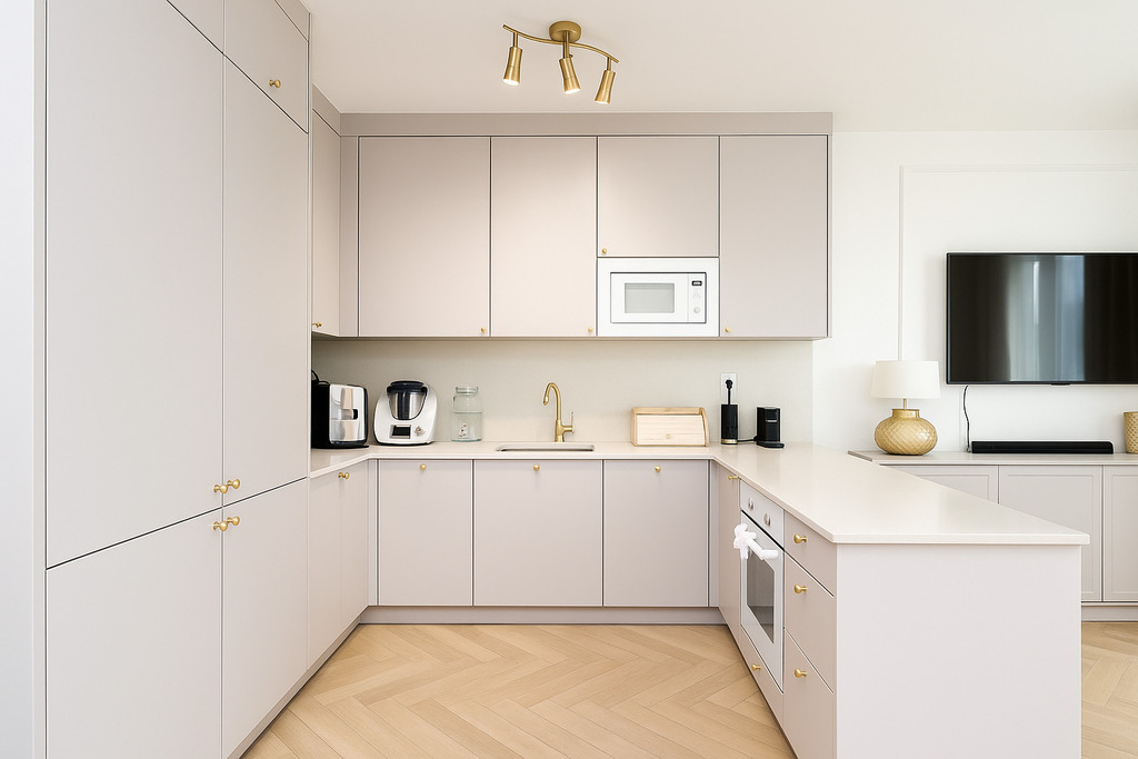 •Kuchnia w kolorze kaszmiru ze złotymi dodatkami – w pełni wyposażona, meble w zabudowie pod wymiar