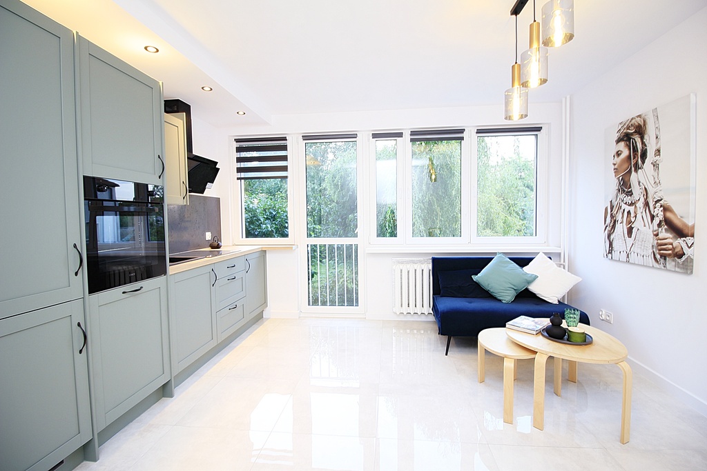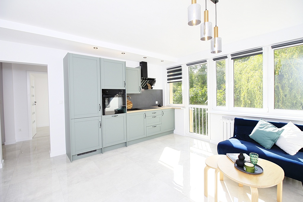 - salon z aneksem kuchennym z nowym sprzętem AGD i balkonem "francuskim" z widokiem na zieleń