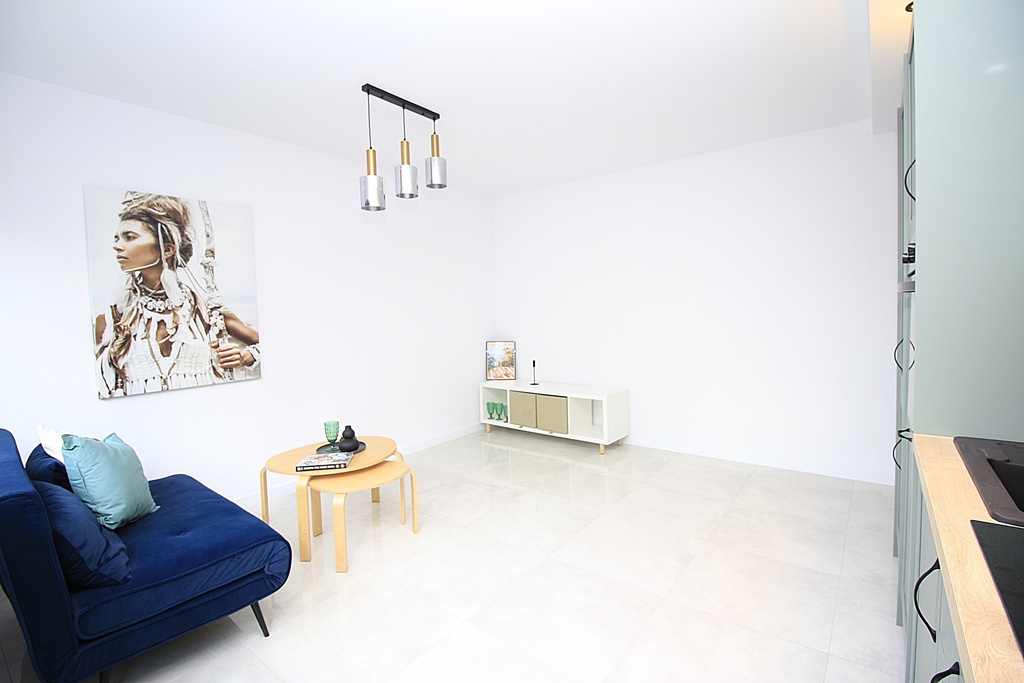 Dzięki przemyślanej aranżacji pierwotnie 2 pokojowe mieszkanie zyskało trzeci niezależny pokój - kuchnię przeniesiono do salonu, co czyni układ nowoczesnym i bardziej funkcjonalnym.