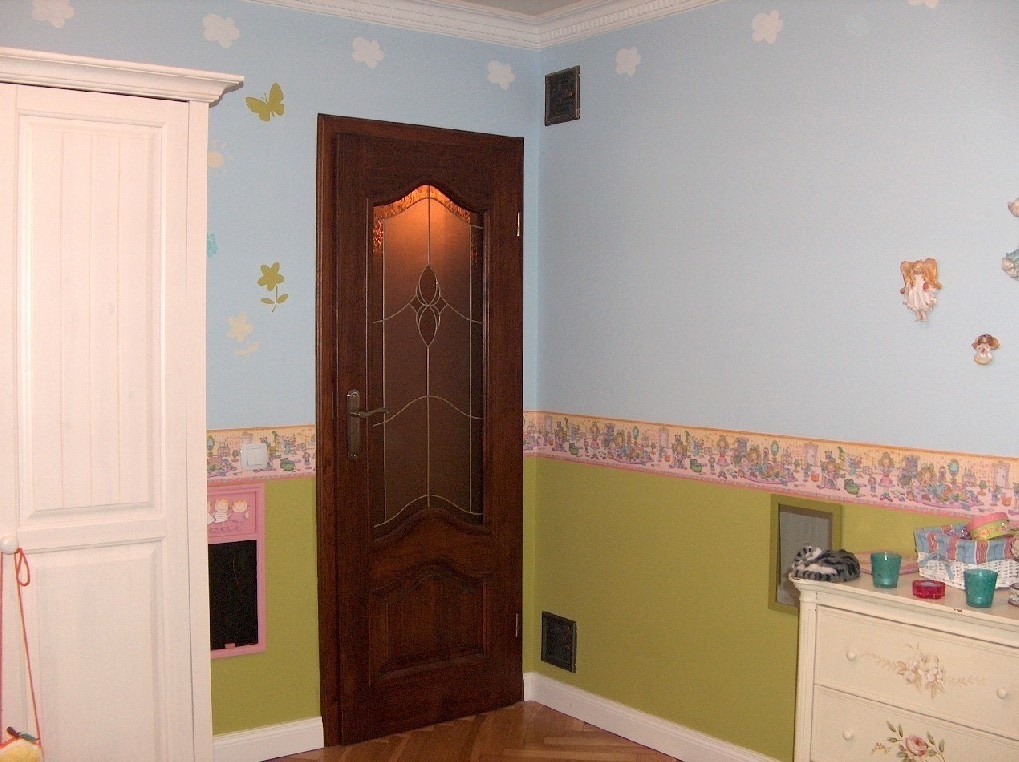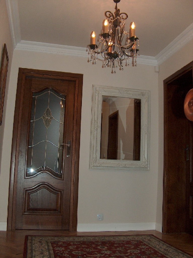Drzwi wewnętrzne dębowe, drzwi zewnętrzne mahoniowe.