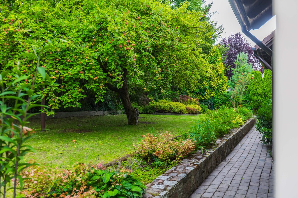 Piękny ogród z licznymi wieloletnimi krzewami i drzewami co daje pełną intymność i klimat ciepła na ogrodzie.