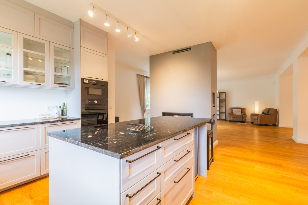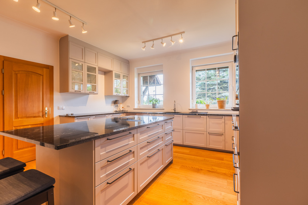 Na parterze Ogromny salon ok 50m2 z pięknym nowym przeziernym kominkiem - w salonie na podłodze śliczna dębowa deska. Kuchnia ok 24m2 - całkowicie nowa zabudowa z wyspą i wysokiej klasy sprzętem AGD, piękne blaty granitowe.