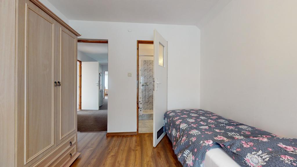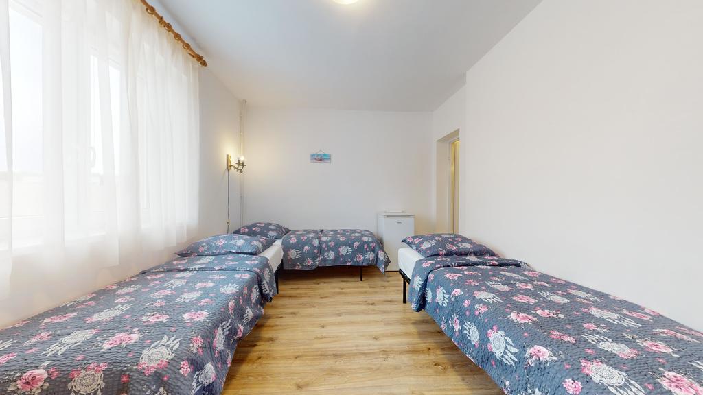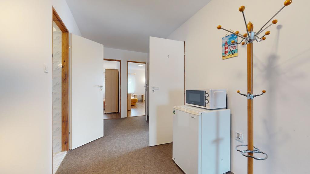 pokój czteroosobowy z łazienką, pokój dwuosobowy z łazienką, pokój trzyosobowy z balkonem i własną łazienką w korytarzu.