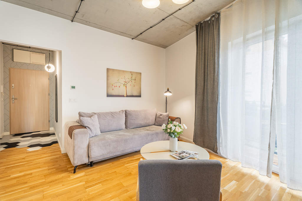 Układ pomieszczeń: Mieszkanie składa się z salonu z aneksem kuchennym, wyzioną przestrzenią sypialnianą oraz łazienki z prysznicem i balkonu.