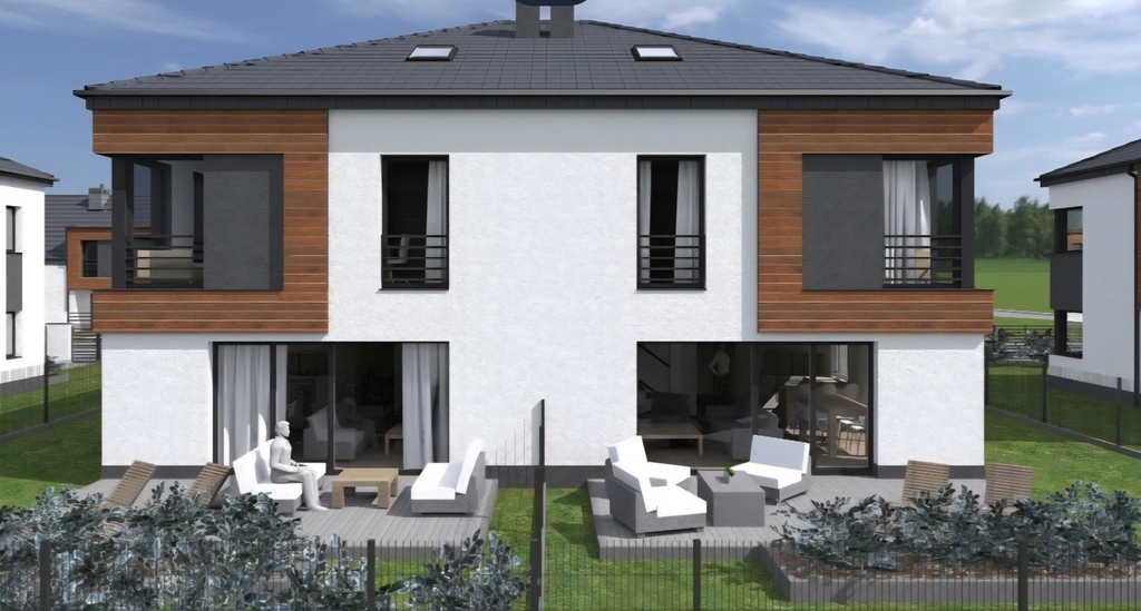 Każdy z domów ma powierzchnię 138m2 + strych i jest usytuowany na działce o powierzchni 300m2. Dom bliźniak został zaprojektowany z troską o komfort użytkowania wszystkich pomieszczeń wyłączając ograniczenia wynikające z różnicy wysokości pomieszczeń.