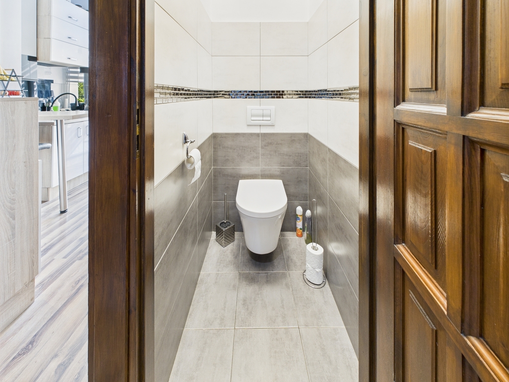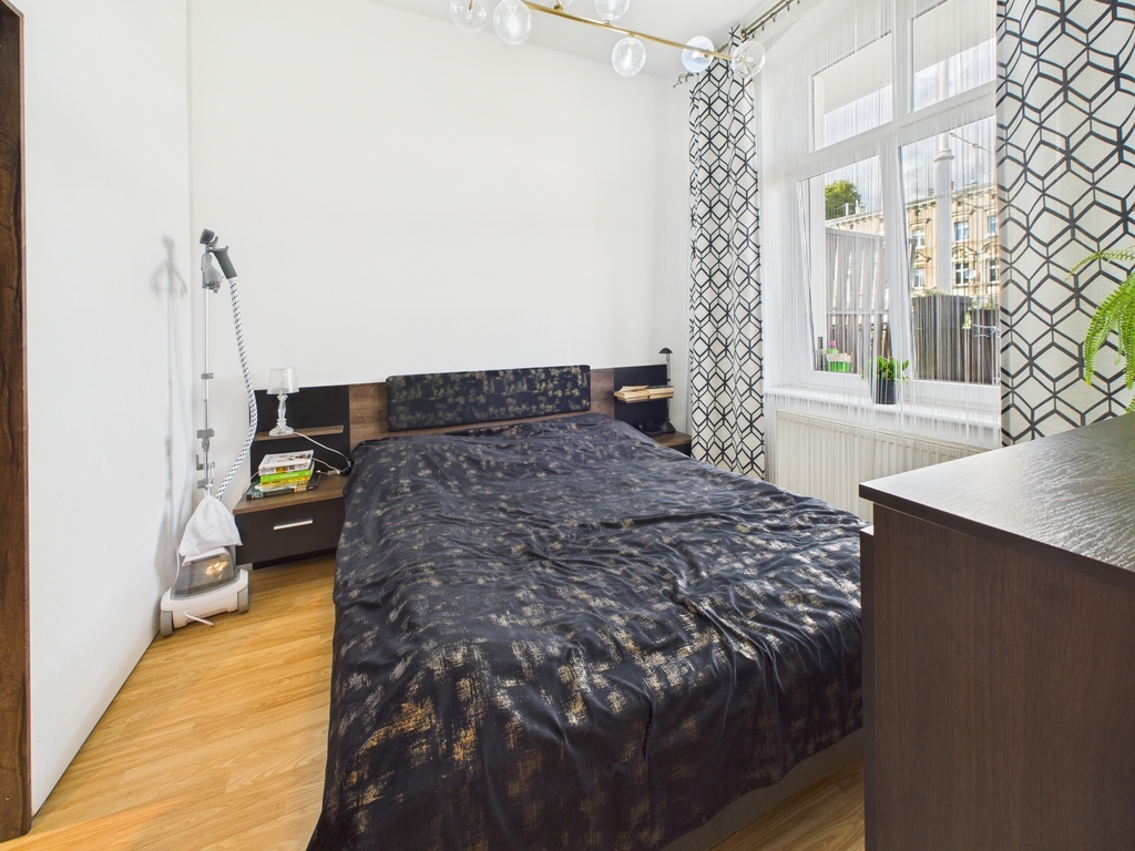 Do mieszkania przynależy balkon z ekspozycją południową – z pięknie ukwieconym parapetem, idealny na poranną kawę. Całość utrzymana jest w spójnym, estetycznym stylu – z dużą dbałością o detale i funkcjonalność. Wnętrza łączą klasyczny charakter kamienicy z nowoczesnym komfortem.