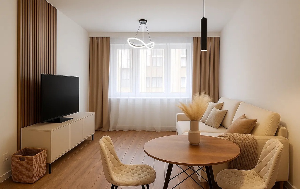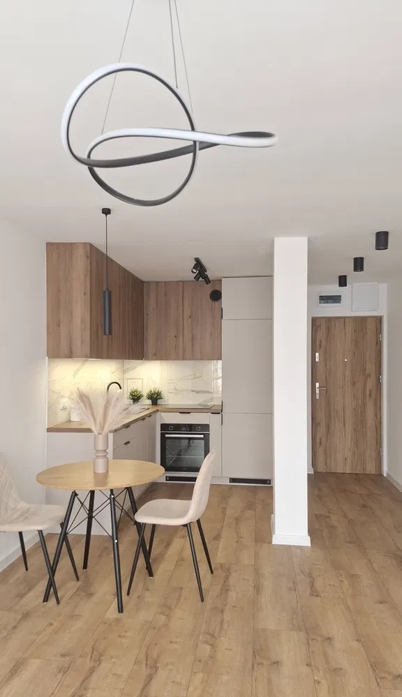 W części dziennej na podłodze panele, ściany wygładzone i pomalowane na neutralne kolory, dodatkowo częściowo ozdobny lamel.