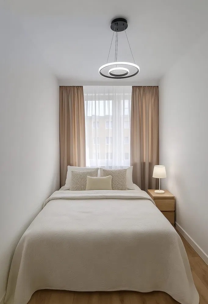 W sypialni na podłodze panele, ściany wygłądzone i pomalowane, na wyposażeniu łózko i szafka nocna.