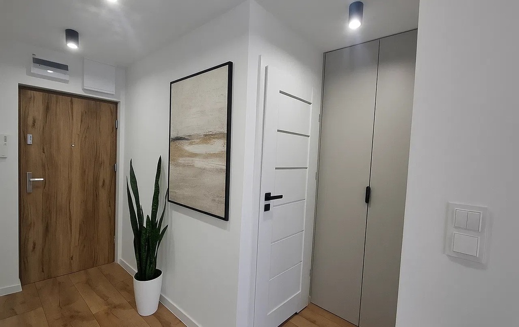 W korytarzu duża szafa na wymiar.