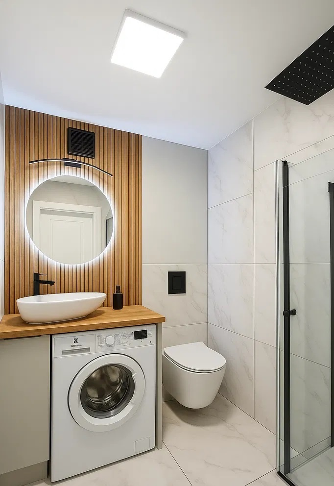 W łazience gres. Na wyposażeniu kabina prysznicowa, szafka, pralka.