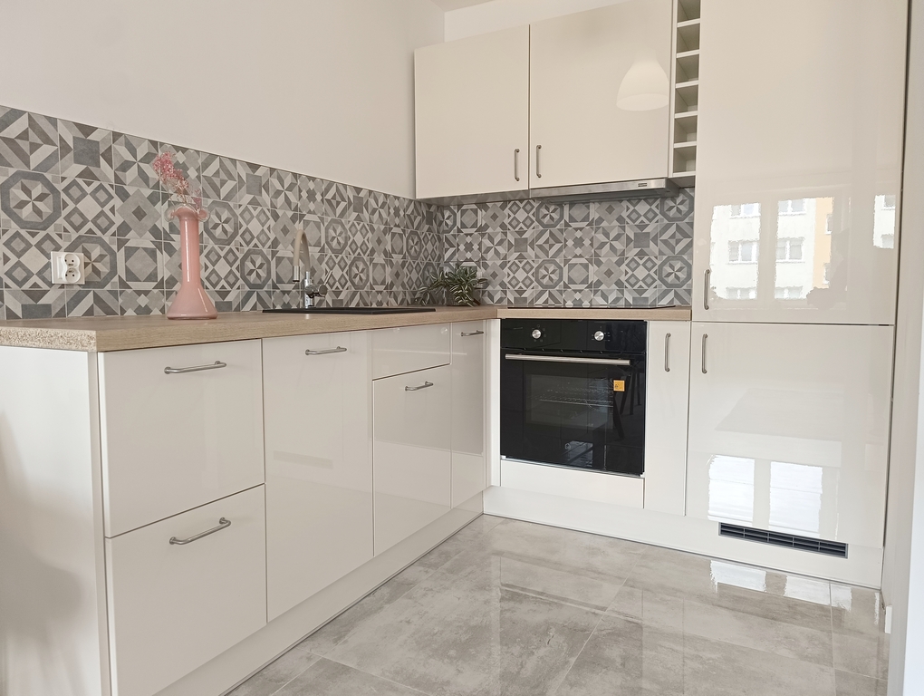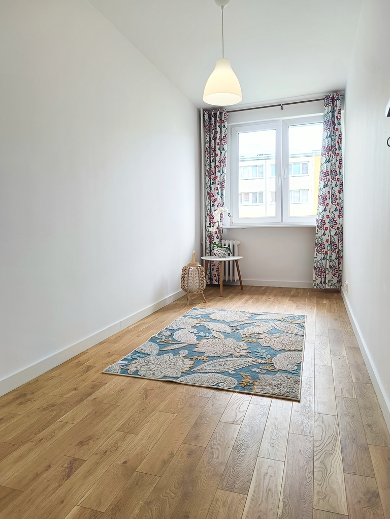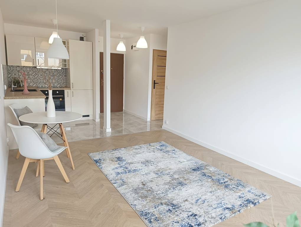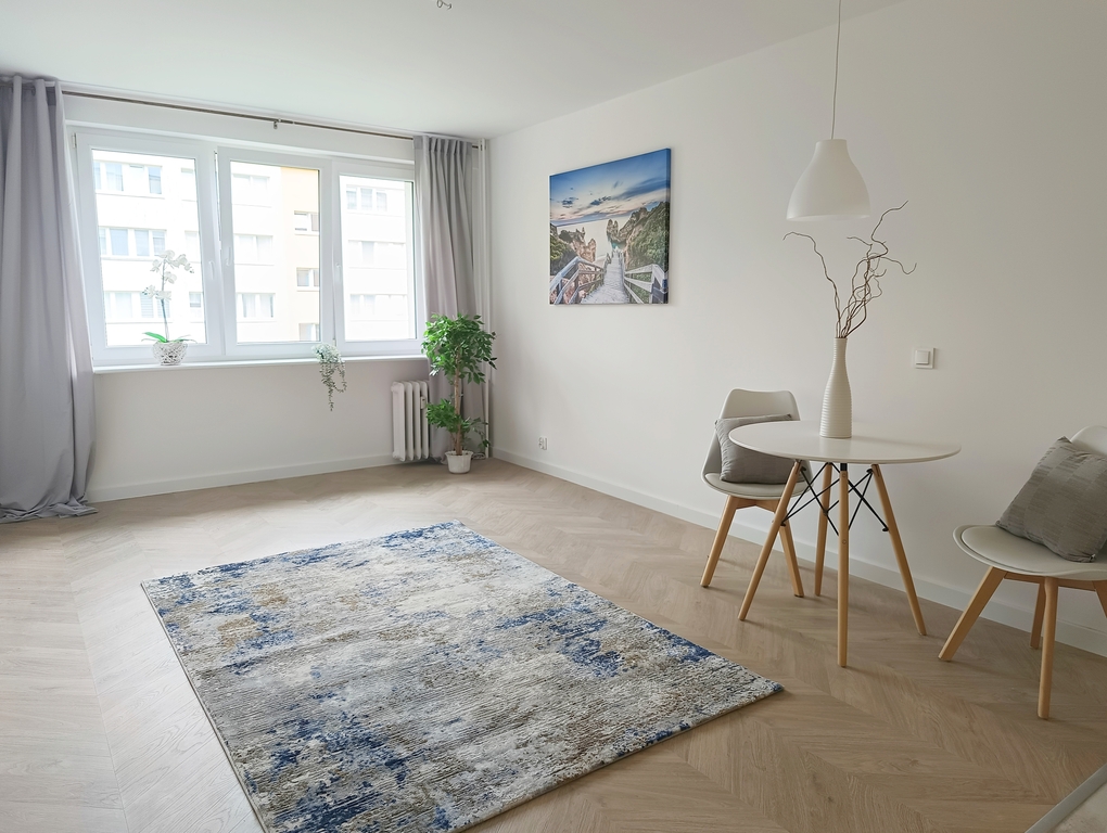 Mieszkanie o powierzchni 37,49 m², usytuowane na I piętrze niskiego bloku po generalnym remoncie.