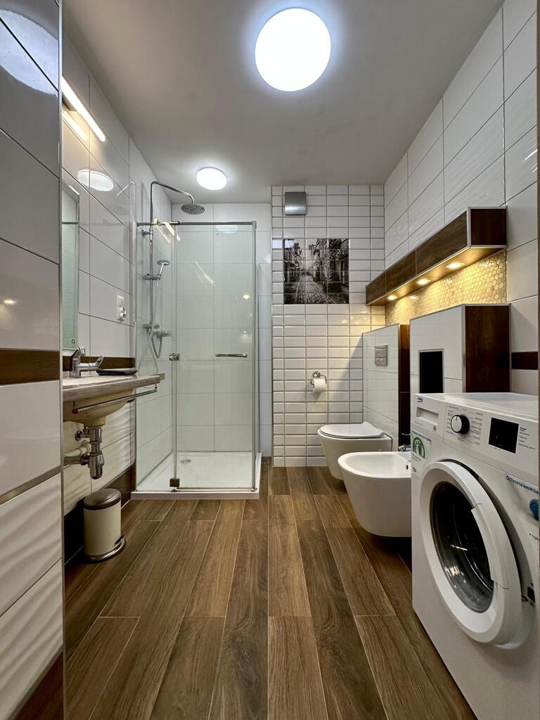 - łazienka z pralką oraz kabiną prysznicową.