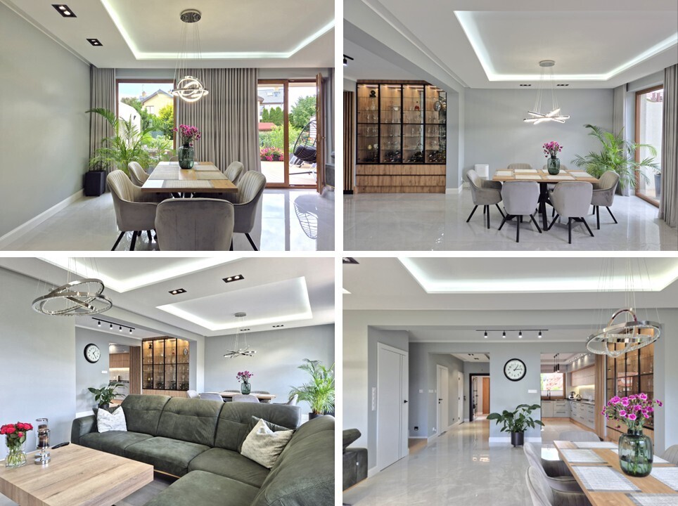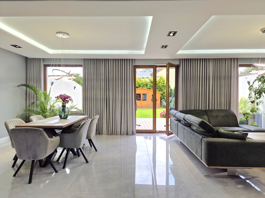 - przestronny salon z wydzieloną jadalnią i częścią do odpoczynku, z wyjściem na taras i dobrze doświetlony dzięki dużym oknom i różnorodnym źródłom światła wewnątrz, a także wyposażony w kominek z nowym wkładem