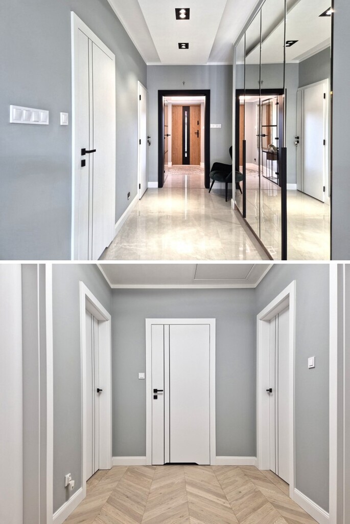 - korytarz z ogromną szafą z lustrzanymi drzwiami przesuwnymi