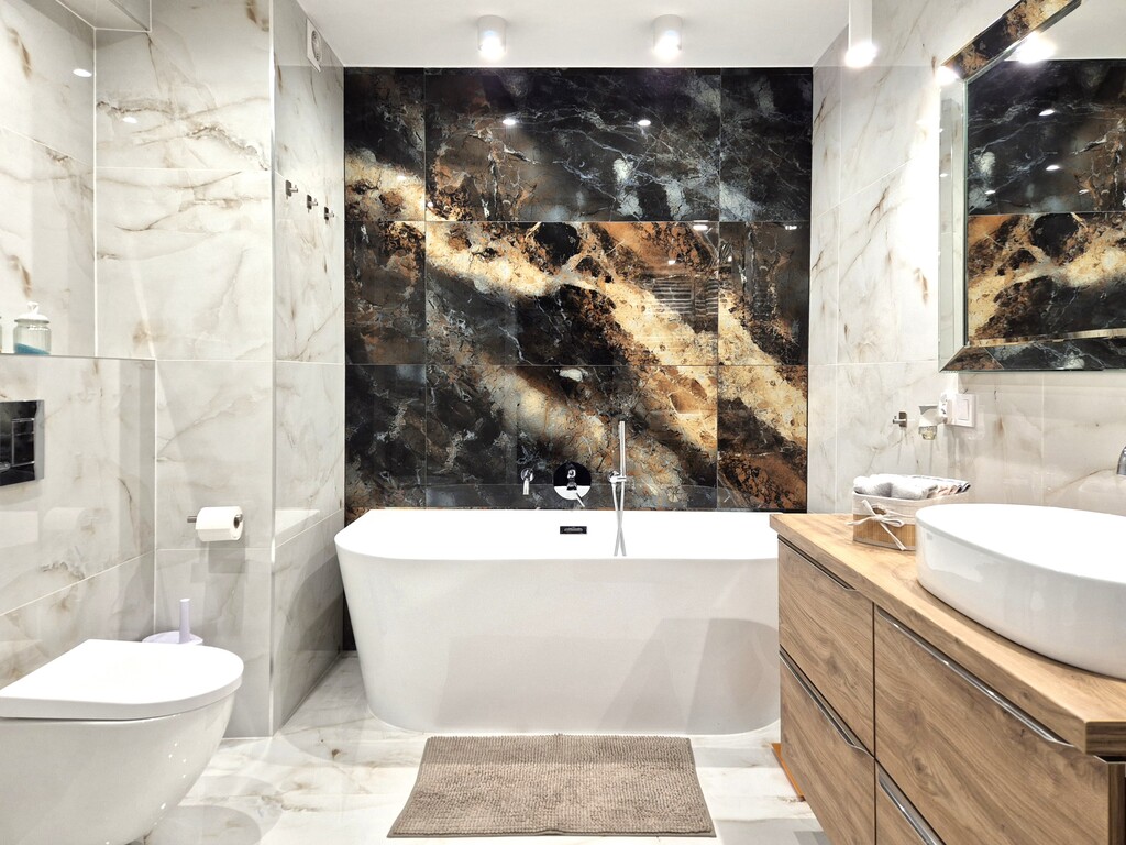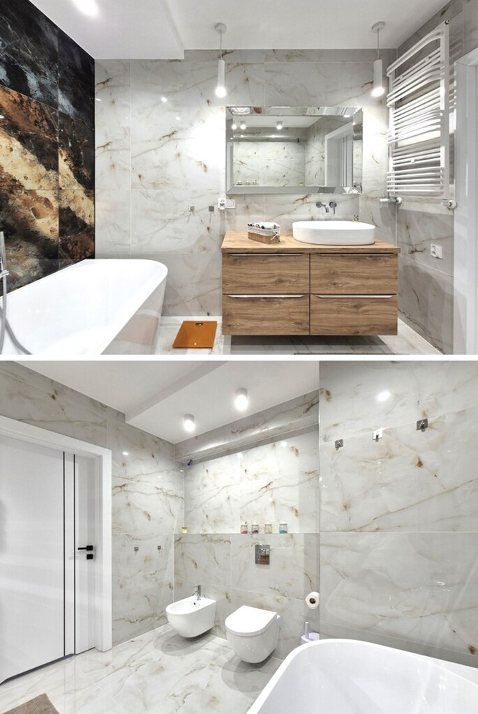 - piękna i przestronna łazienka, dobrze oświetlona, z wanną wolnostojącą, wc, bidetem, umywalką nablatową oraz szafką wiszącą z szufladami