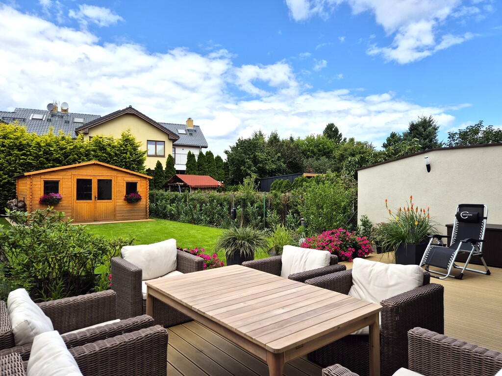 * spory taras, zupełnie nowy, na którym mieszczą się z łatwością rattanowe meble ogrodowe, fotele wiszące oraz kilka foteli do opalania