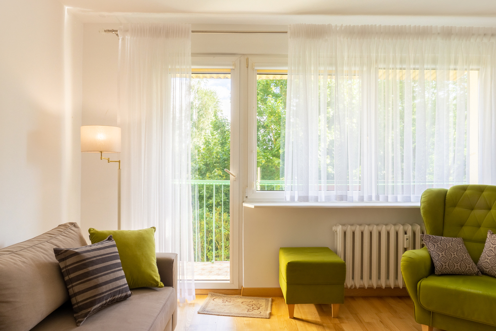 - Salon z wyjściem na duży balkon i widokiem na zieleń