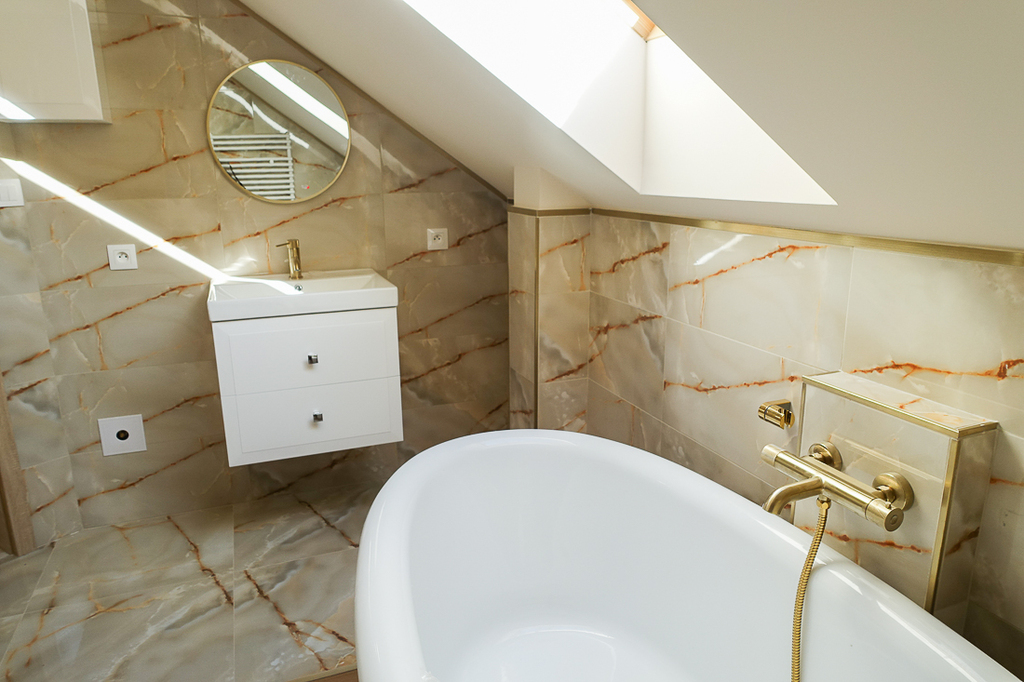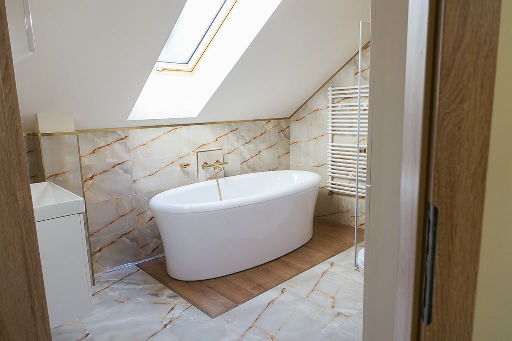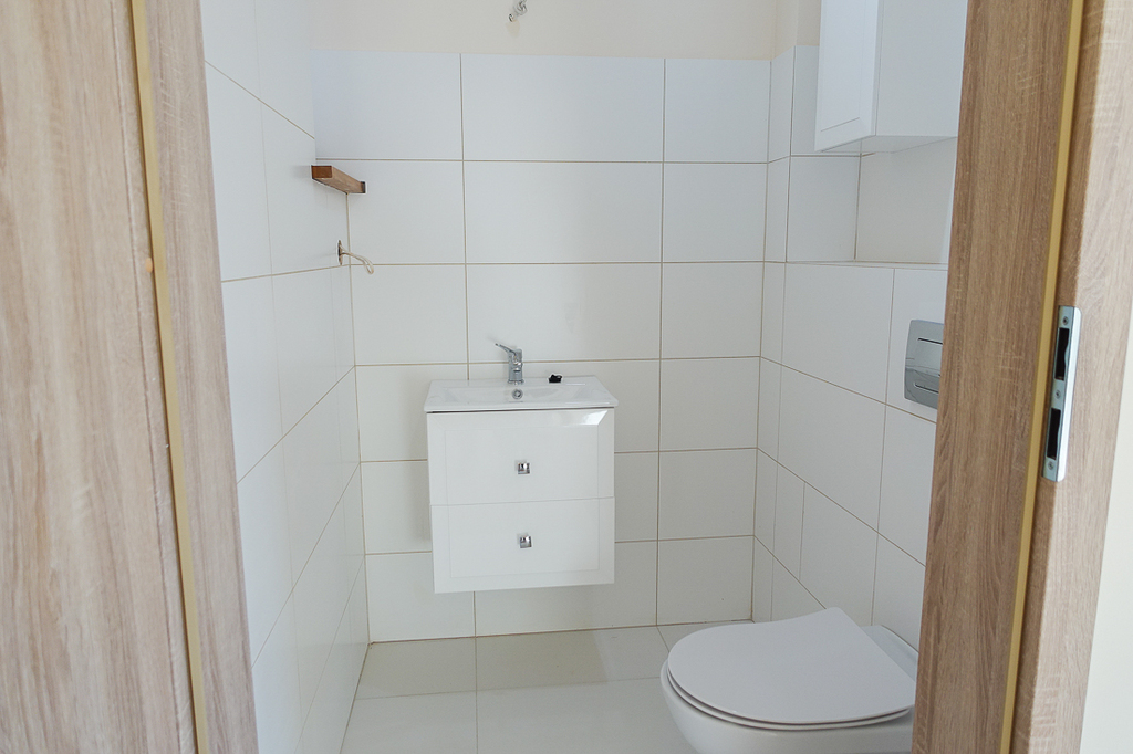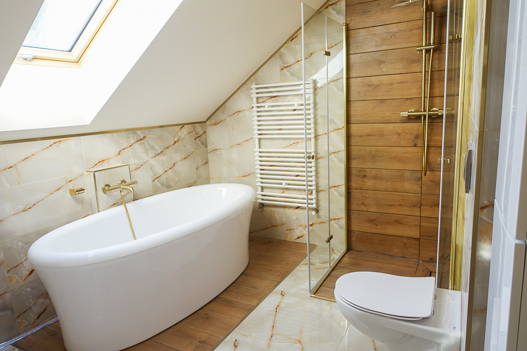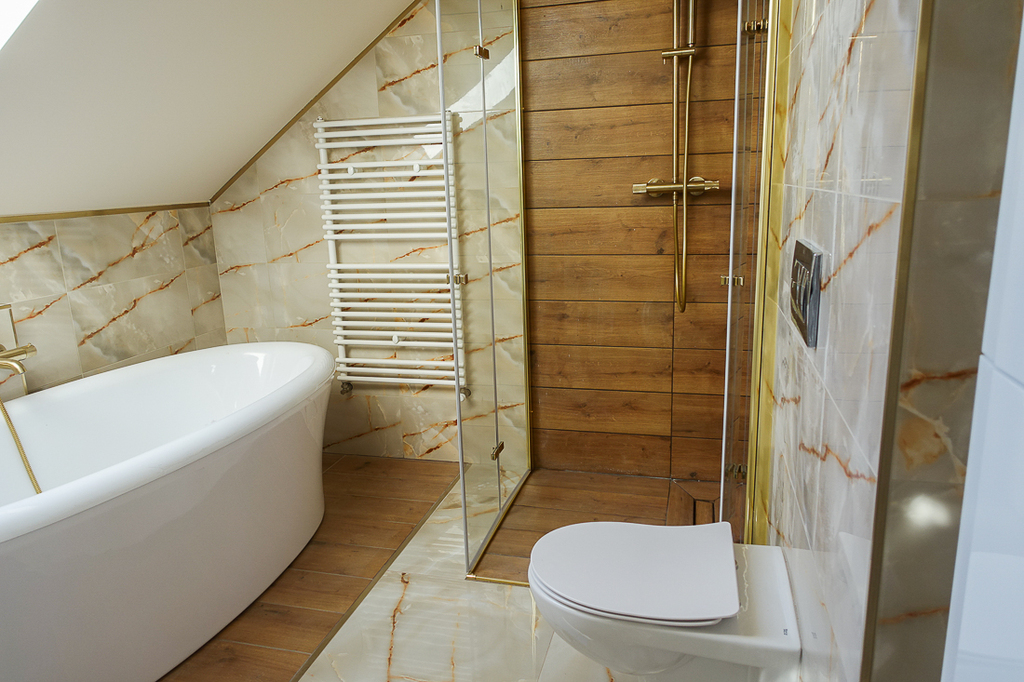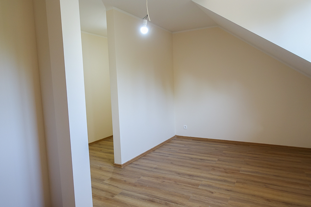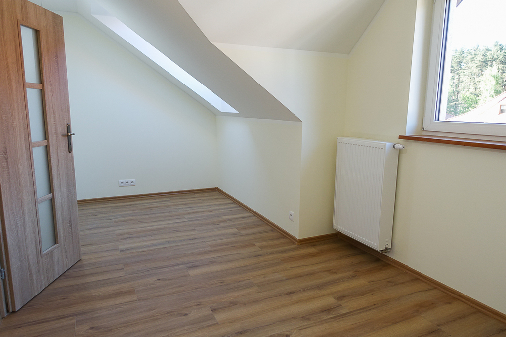 PIĘTRO: 60,89 m2 ogółem (po podłodze 143,16 m2) w tym: pokoje 13,47 m2, 7,83 m2, 13,26 m2, 9,98 m2, łazienka 5,4 m2 z oknem połaciowym, w łazience natrysk z odpływem liniowym, wanna, umywalka z szafką, WC z systemem GEBERIT, w glazura i terakota (powierzchnia po podłodze nieco większa z uwagi na nieuciążliwe skosy).