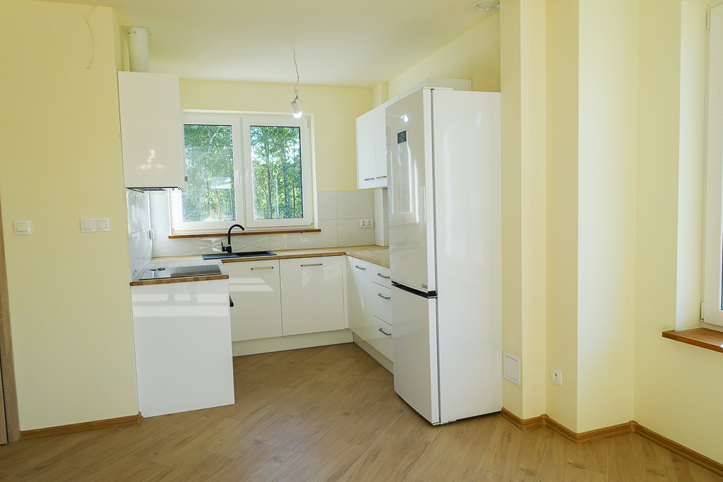 OPIS BUDYNKU: Parter: salon, kuchnia, WC, przedsionek, pełne schody na piętro, na piętrze 4 pokoje, łazienka. Niewysokie poddasze. Na podłogach wysokiej jakości terakota na parterze i panele na piętrze w pokojach i przedpokoju, w kuchni zabudowa meblowa, płyta grzewcza elektryczna, piekarnik, lodówka, zlewozmywak, na podłodze terakota, na ścianach glazura, w WC i w łazience glazura i terakota, okna PCV trójszybowe, parapety drewniane. Projekt DOM W CYKLAMENACH.