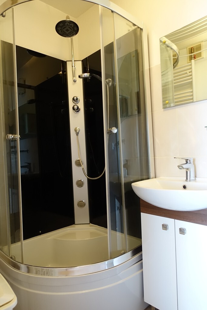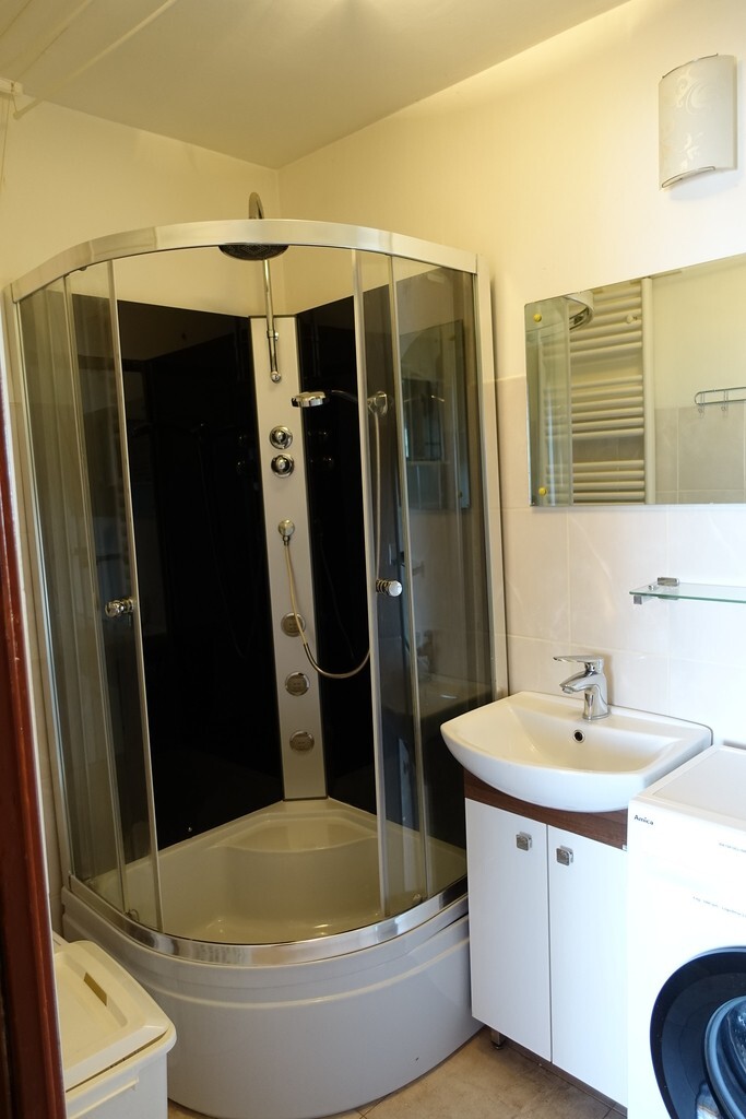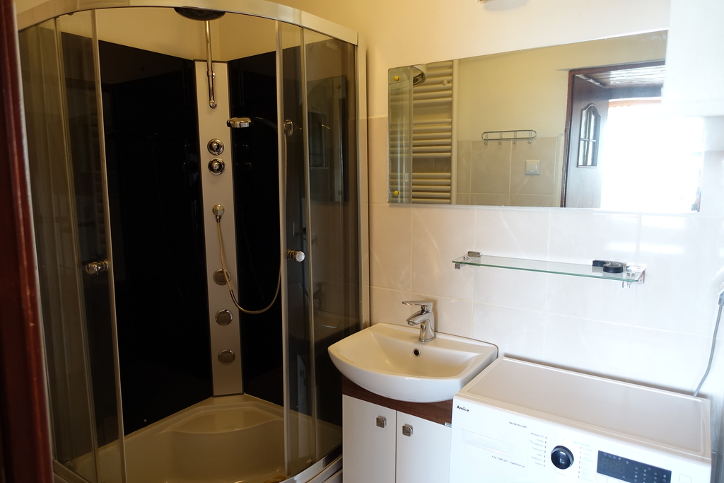 Na podłodze panele, parkiet oraz terakota. Okna PCV. W kuchni zabudowa meblowa, kuchenka gazowa z piekarnikiem gazowym, lodówka, zlewozmywak, pochłaniacz. Na podłodze terakota, na ścianach glazura. W łazience kabina prysznicowa z hydromasażem, pralka, umywalka. WC oddzielnie.