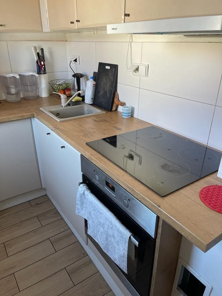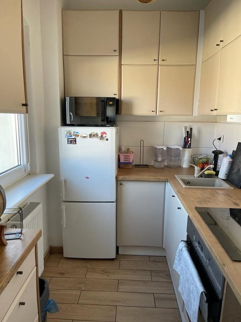 Kuchnia w zabudowie, wyposażona w sprzęt AGD.