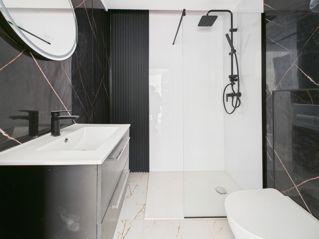 * nowoczesna łazienka z designerskimi elementami: czarna armatura, duże lustro, stylowe wykończenia;