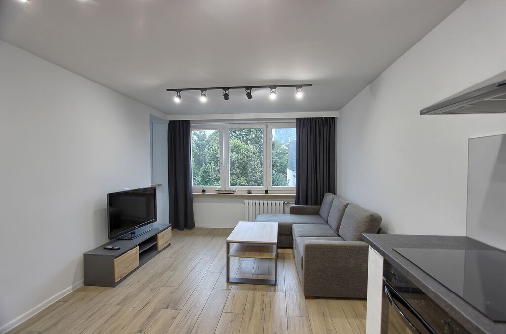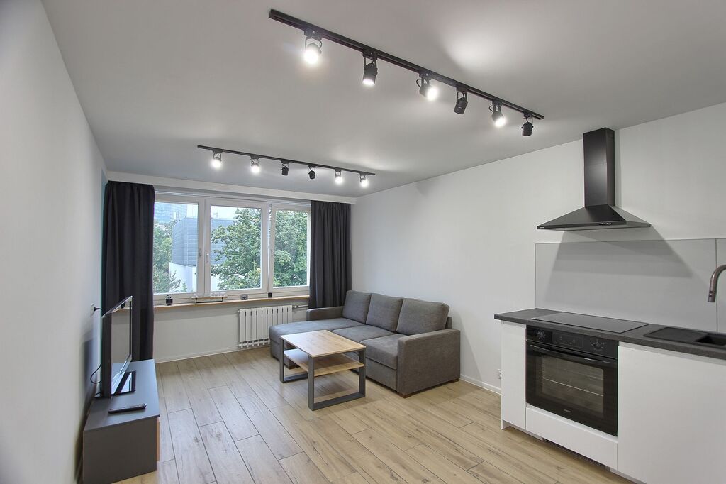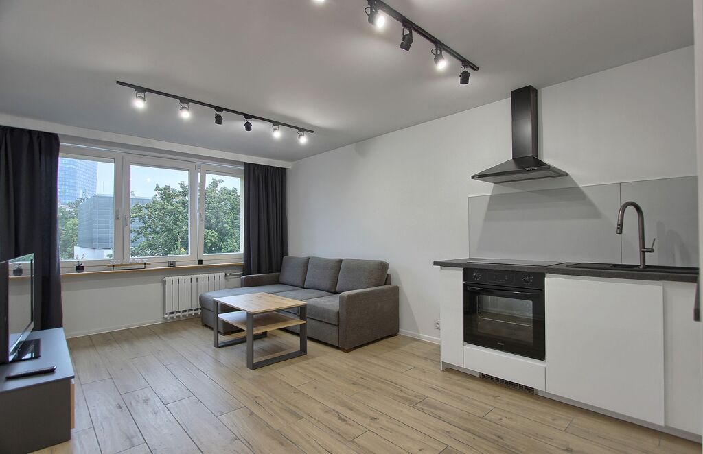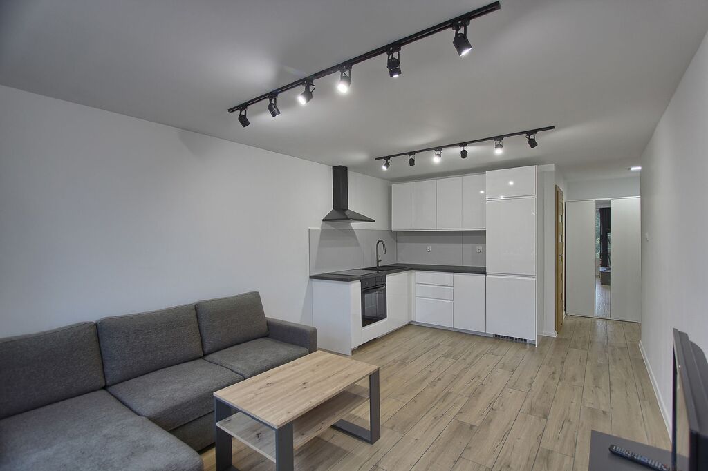 Salon z aneksem kuchennym w pełni wyposażonym w zabudowę kuchenną i nowe AGD.