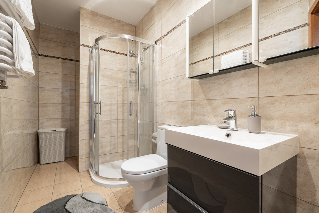Łazienki: Dwie nowoczesne łazienki, wykończone w wysokim standardzie, z elegancką armaturą oraz stylowymi kafelkami. W jednej z łazienek znajduje się pralka i suszarka marki Miele, co zapewnia wygodę i funkcjonalność.