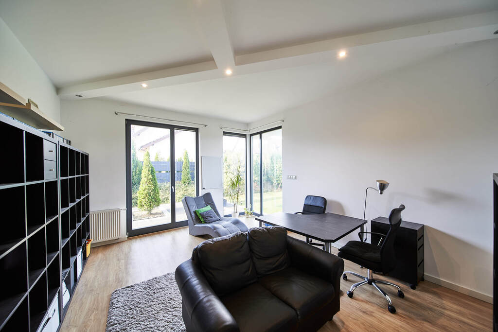 PARTER: wiatrołap (12,53 mkw), komunikacja (47,53 mkw), pomieszczenie pomocnicze (12,65 mkw), pokój (21,45 mkw), łazienka (4,19 mkw), pokój dzienny (36,43 mkw), kuchnia (20,46 mkw), komunikacja (20,46 mkw), sala kinowa (20 mkw), garaż (26,56 mkw), pom. gosp. (6,5 mkw), pom. tech. (6,55 mkw), jadalnia (16,25 mkw). Na podłogach znajduje się elegancki parkiet dębowy oraz terakota. okna drewniane z roletami zewnętrznymi. Kuchnia w zabudowie wraz ze sprzętem najwyżej jakości pozostaje w cenie. Z salonu wyjście na taras.