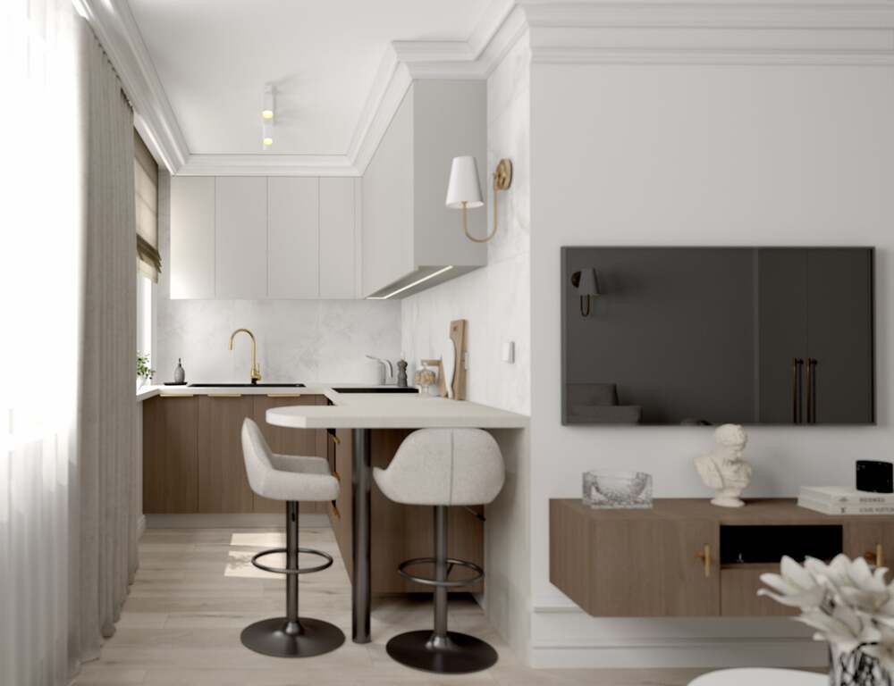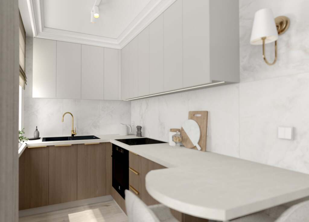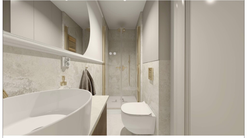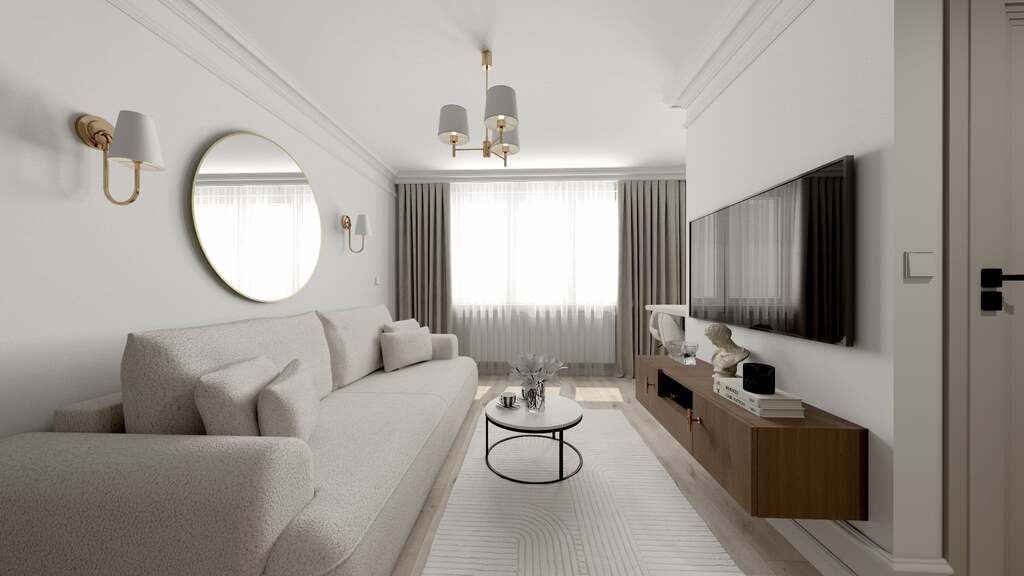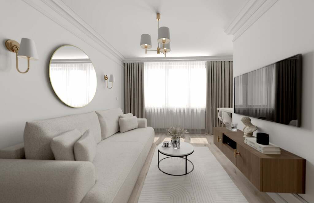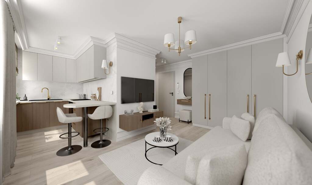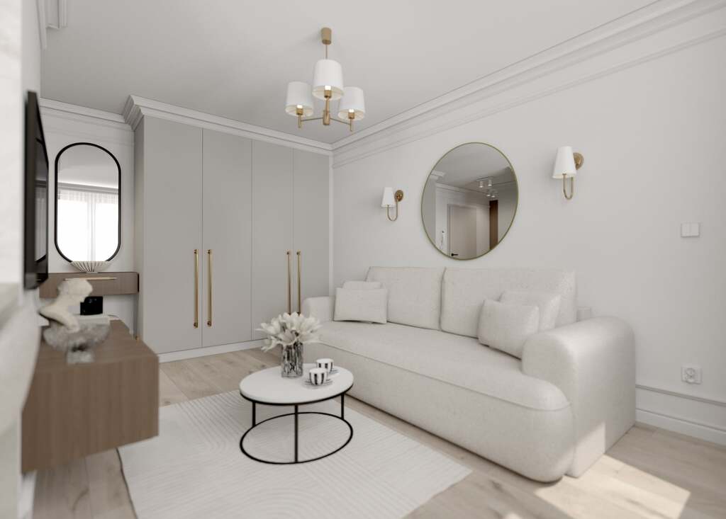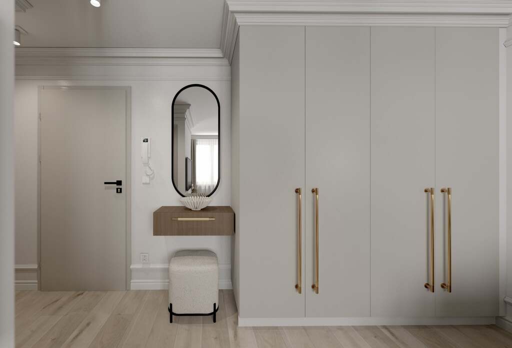 Mieszkanie zaprojektowane w eleganckim, ponadczasowym stylu – jasna kolorystyka, złote akcenty, stylowe oświetlenie, lustra.