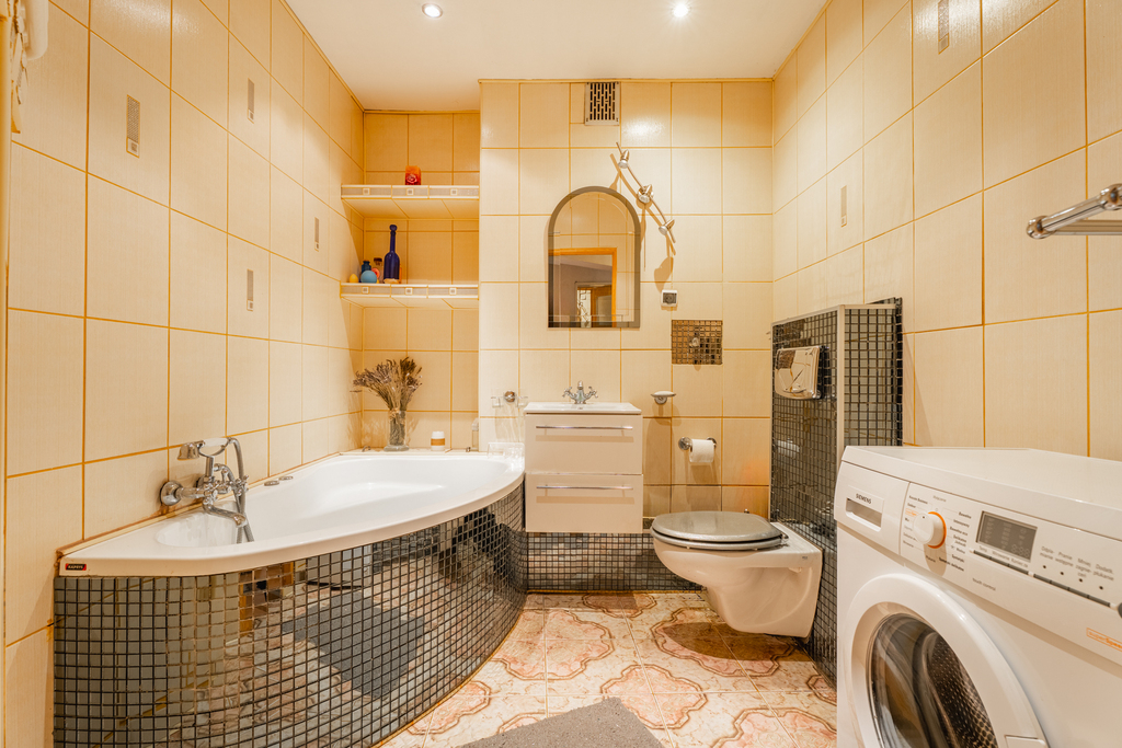 Przestronny salon z wyjściem na balkon, do własnego doposażenia (obecnie znajduje się jedynie stolik z krzesłami i wieszak na telewizor). Sypialnia w pełni wyposażona w: łóżko dwuosobowe z materacem, dwie szafki z lampkami, duża szafa na ubrania, biurko, dodatkowe półeczki. Duża kuchnio-jadalnia wyposażona we wszelkie niezbędne sprzęty: kuchenka elektryczna, piekarnik, okap, zmywarka, lodówko-zamrażarka dwudrzwiowa, zlewozmywak, stół z miejscami do siedzenia i dodatkowym oświetleniem, meble w zabudowie z dużą ilością miejsca do przechowywania rzeczy. W łazience: wanna z hydromasażem, WC, pralka, umywalka z szafką i lustrem, dodatkowe półki do przechowywania rzeczy. W przedpokoju znajduje garderoba w zabudowie, komoda, wieszak na ubrania.