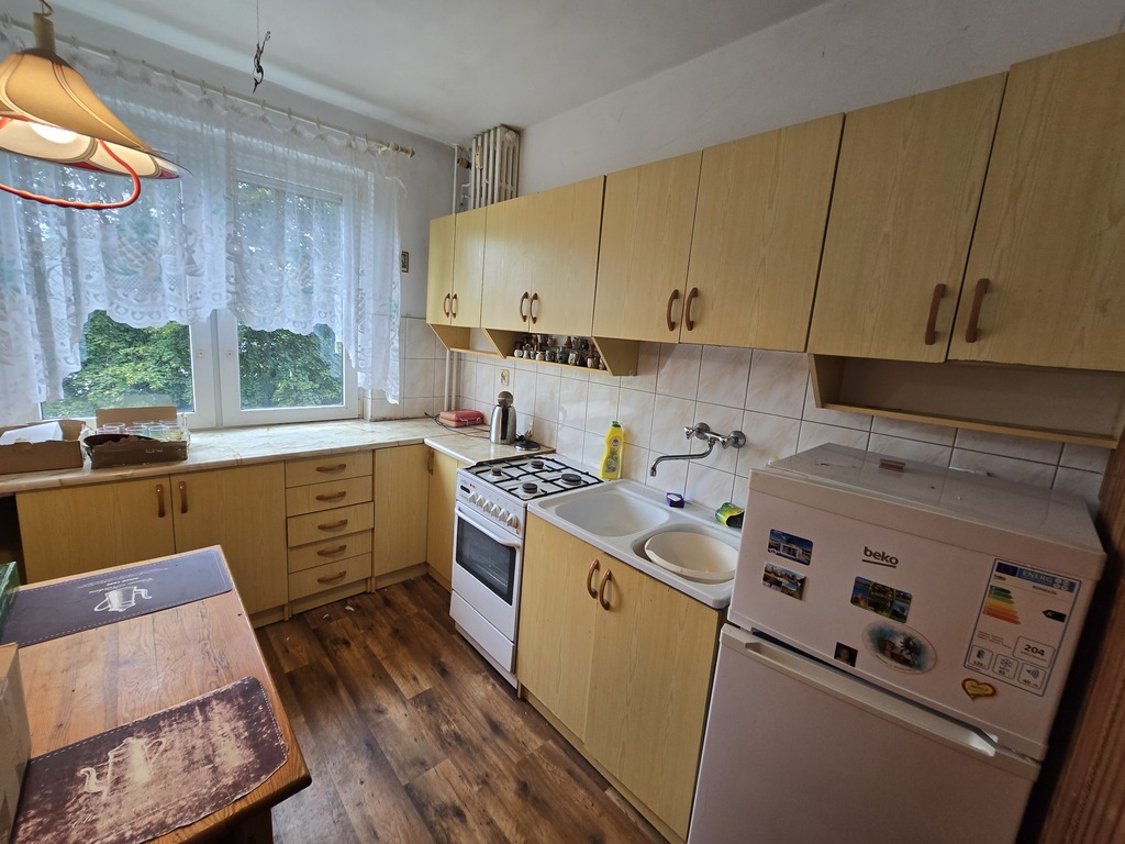 duży pokój z wyjściem na balkon, sypialnia, oddzielna kuchnia, łazienka, wc oraz przedpokój. Do mieszkania przynależna jest piwnica.