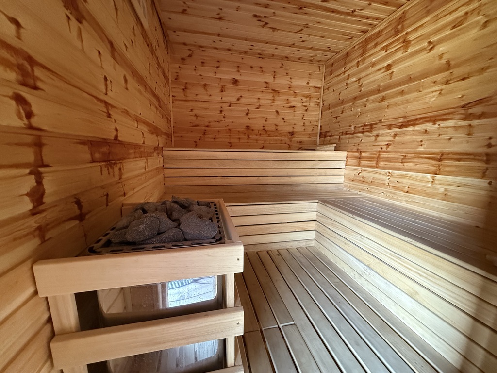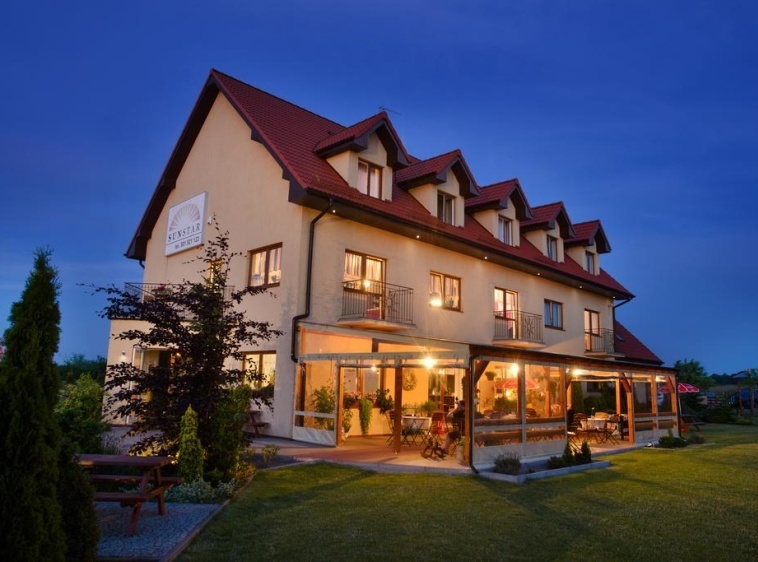 z częścią turystyczną - 3 apartamentów, 5 pokoi 3-osobowych oraz 3 pokoi 2-osobowych (wyposażenie każdego pokoju obejmuje łazienkę, lodówkę i telewizor) ; jadalni, kawiarenki, ogromnej kuchni, strefy rekreacyjnej z sauną i jaquzzi, recepcją