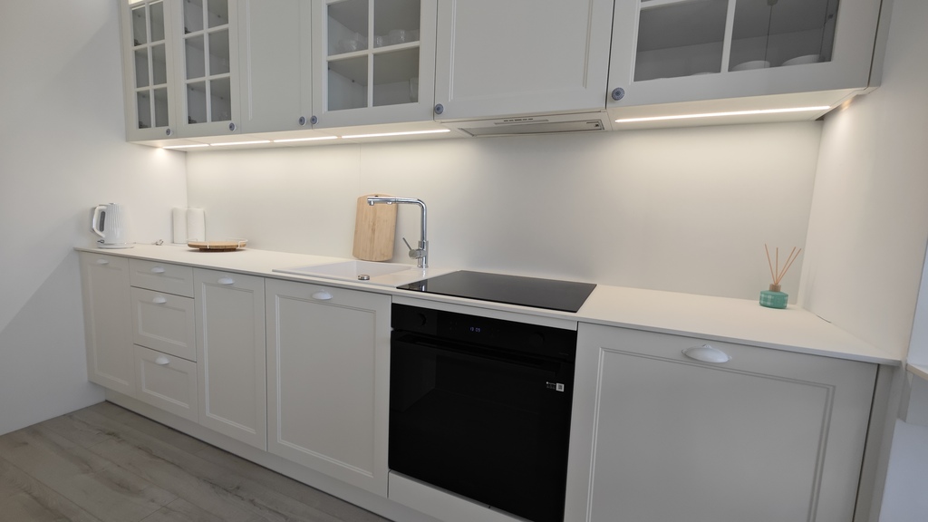 W salonie po lewej stronie część wypoczynkowa (stolik kawowy z krzesłami i komodą ) zaś prawą stronę zagospodarowano na część sypialnianą z nowym łóżkiem 1,60m x 2m (istnieje możliwość podzielenia salonu na dwa mniejsze pokoje). W pokoju, kuchni i holu - nowe panele na podłodze, ściany gładzone i pomalowane na biało. Między kuchnią a salonem znajduje się mini wyspa z dwoma hokerami. W kuchni pozostaje umeblowanie wykonane przez stolarza plus sprzęt AGD w zabudowie (piekarnik elektryczny, płyta grzewcza indukcyjna, zmywarka - wszystko firmy Samsung oraz mała lodówka). W łazience nowoczesny gres na podłodze i ścianach plus przeszklona kabina prysznicowa, umywalka z szafką, podwieszana muszla oraz grzejnik drabinkowy. Dodatkowo w łazience szklane drzwi wejściowe. Kuchnia oddzielona od holu trzyczęściową szafą.
