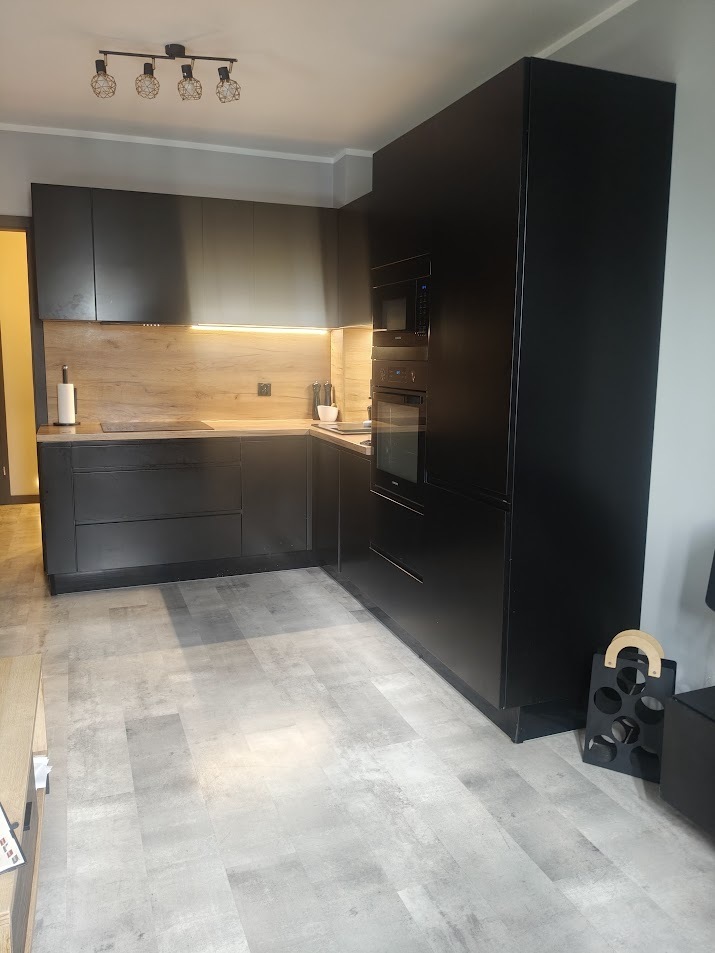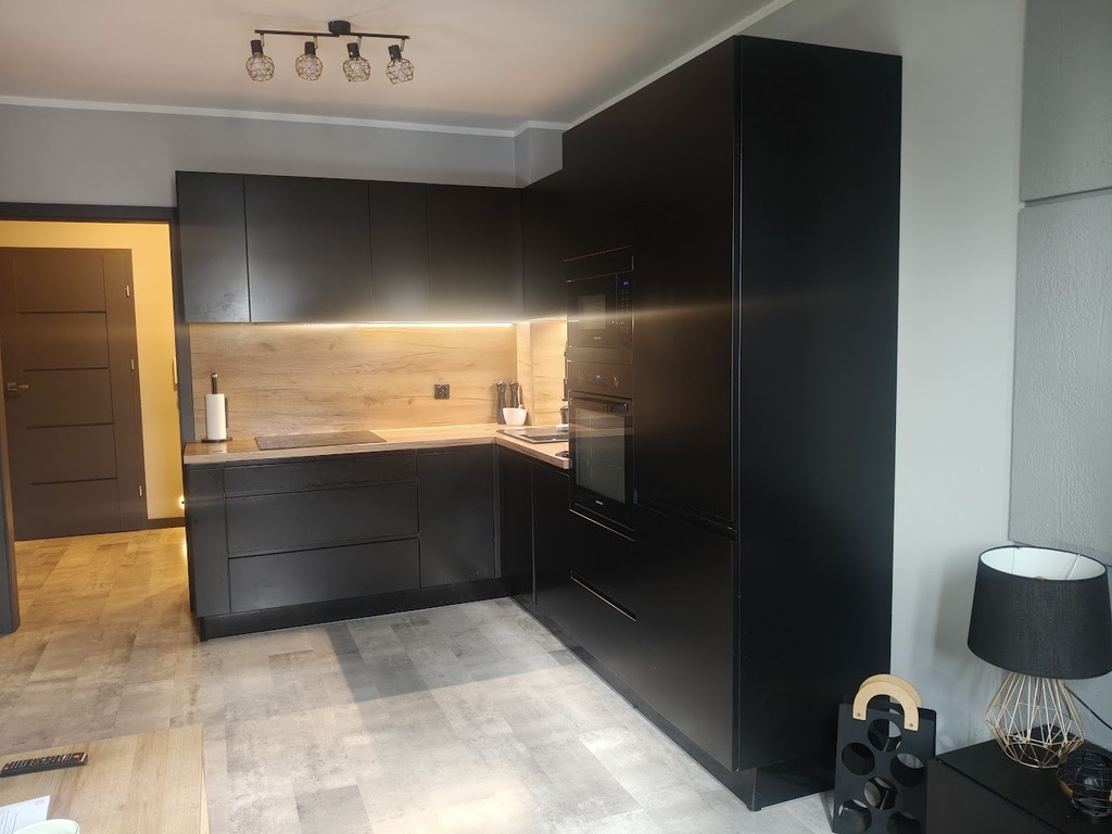 przestronny salon z aneksem kuchennym w pełnej zabudowie i wysokiej klasy sprzętem AGD,