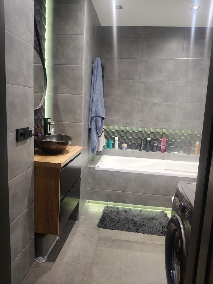 nowoczesna łazienka z WC, wykończona w eleganckiej glazurze i terakocie,