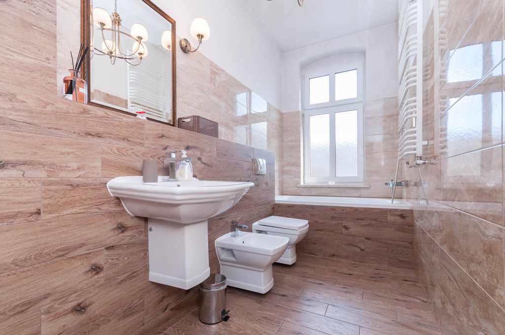 - łazienki z wanną , pralki, umywalki, dużego lustra , bidetu, toalety, wiszącej półki