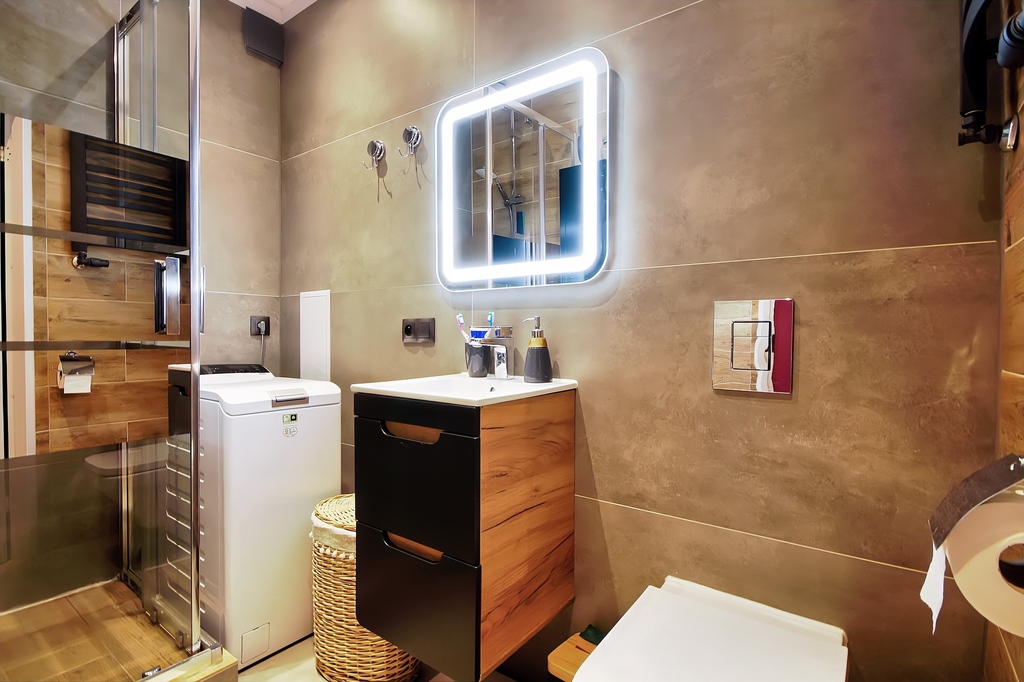 Mieszkanie składa się z 2 pokoi, w tym przestronnego salonu z wyjściem do widnej kuchni, która jest w pełni wyposażona w nowoczesny sprzęt AGD, co zapewnia komfort codziennego użytkowania. Sypialnia, wyposażona w szafę w zabudowie, oferuje przytulną przestrzeń do odpoczynku, a dodatkowe miejsce do przechowywania zapewnia szafa w przedpokoju oraz piwnica o powierzchni 3,65 m². Łazienka jest nowoczesna, z prysznicem i pralką, co zwiększa funkcjonalność mieszkania.