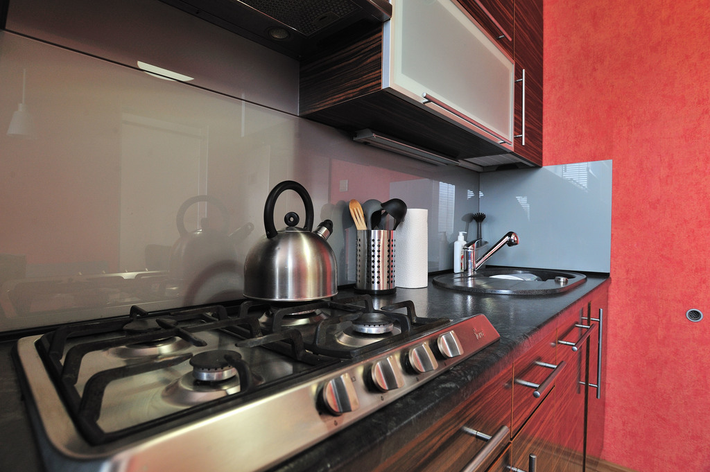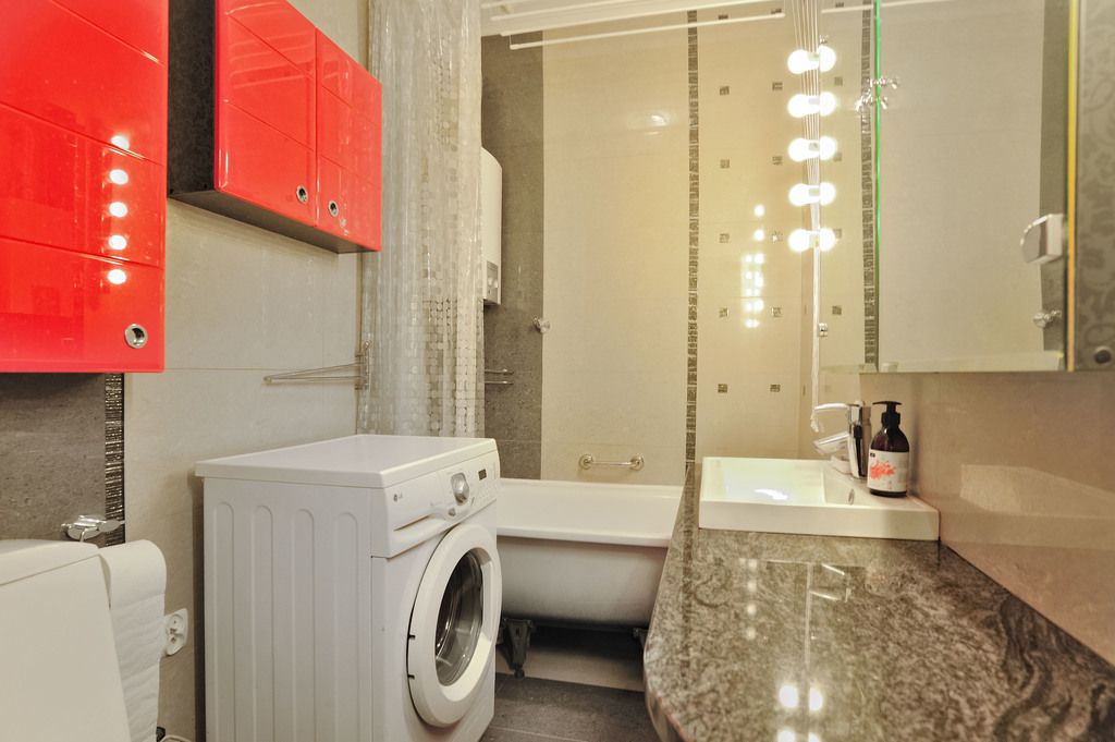 Łazienka wyposażona jest w wannę, pralkę, umywalkę z szafką z lustrem, szafki wiszące, wc, grzejnik drabinkowy. Kuchnia jest umeblowana i wyposażona w sprzęt AGD - płytę gazową, piekarnik wolnostojący, lodówkę z zamrażalnikiem, zmywarkę.